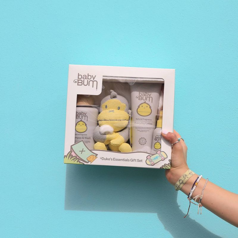 •BABY BUM® DUKE'S ESSENTIALS GIFT SET. Our 4-piece gift set featuring Duke's Everyday Essentials: Shampoo & Wash, Everyday Lotion, Hand Sanitizer and Duke Knit with blankie.