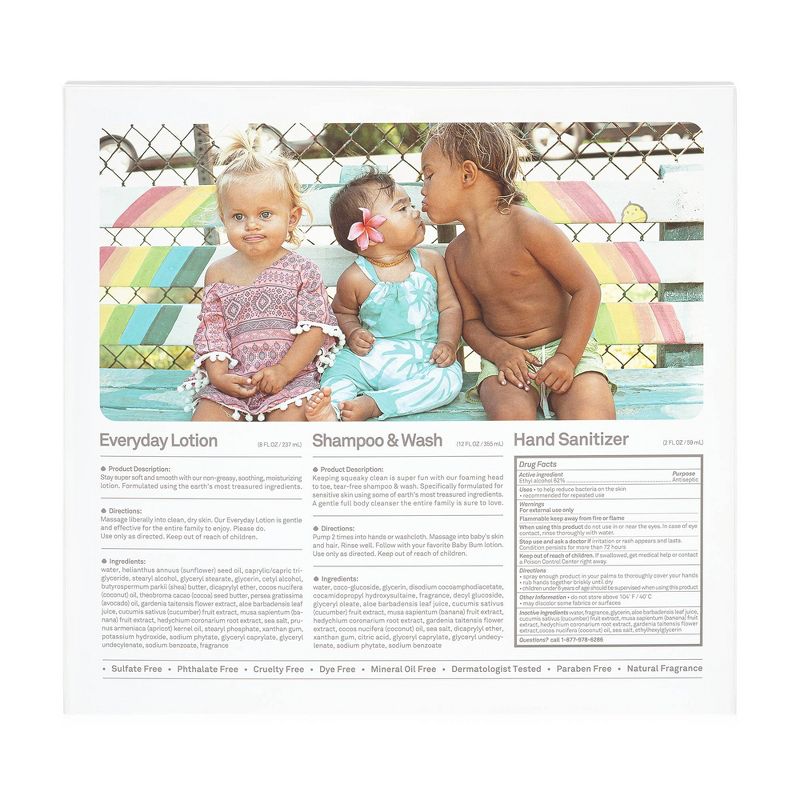 Our Baby Bum® Essentials Gift Set includes all of our favorites and makes the perfect baby gift. This gift set includes all of the essentials: (1) Baby Bum® Shampoo & Wash, (1) Baby Bum® Everyday Lotion, (1) Baby Bum® Hand Sanitizer, and (1) cozy blanket. Create a memorable bath time routine with Baby Bum® Shampoo & Wash that is specifically formulated for babies, toddlers and kids with naturally moisturizing ingredients, such as monoi coconut oil, aloe and white ginger to soothe sensitive skin. Follow up with Baby Bum® Everyday Lotion that will soothe and nourish skin with our non-greasy formula. After bath time, cuddle your little one in the super soft baby blanket. Our Baby Bum® Hand Sanitizer Spray is great for on the go. It is a no-rinse antibacterial spray with sugar cane alcohol infused with oils and fruit extracts. Tested to kill 99.9% of germs without harsh chemicals.