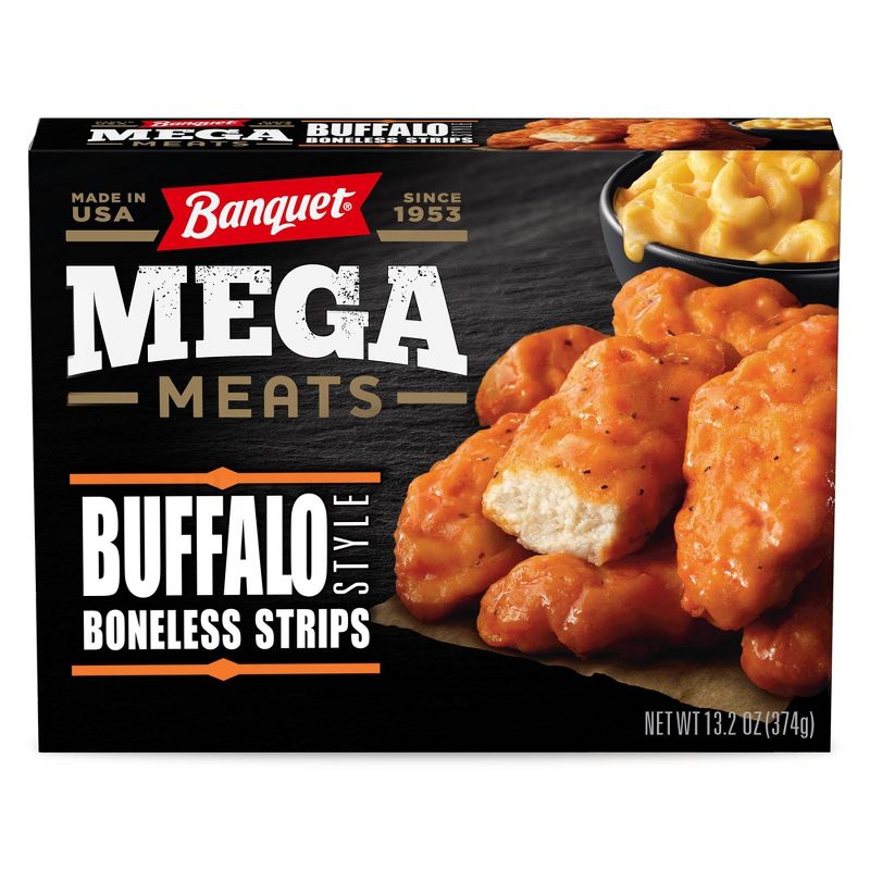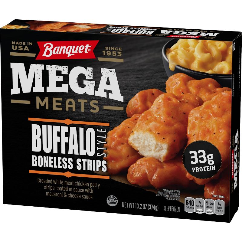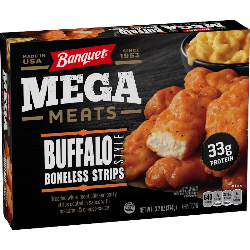 •Contains one 13.2-ounce Banquet Mega Meats Buffalo-Style Boneless Chicken Strips With Creamy Macaroni & Cheese Frozen Meal