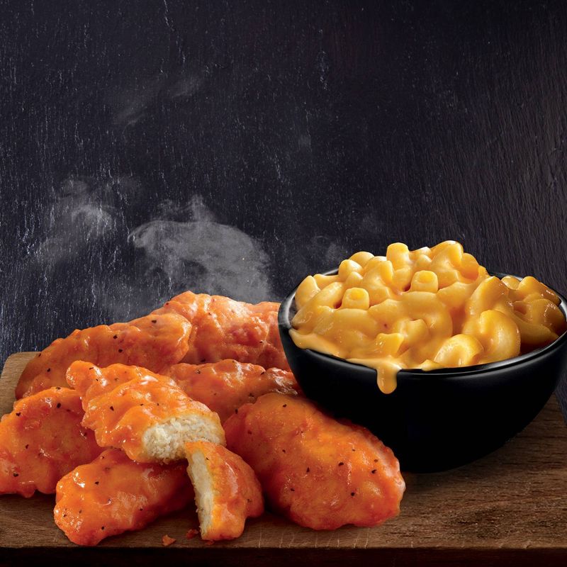 •Indulge in delicious breaded white meat chicken strips in a spicy buffalo-style sauce with creamy macaroni and cheese