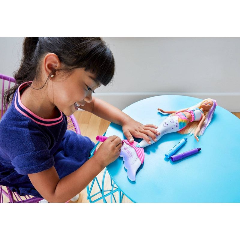 •Dive into design with Barbie and Crayola -- the Barbie Dreamtopia Color Magic Mermaid doll has a bodice, tail and fins meant to be colored on with the included Crayola washable color wands!