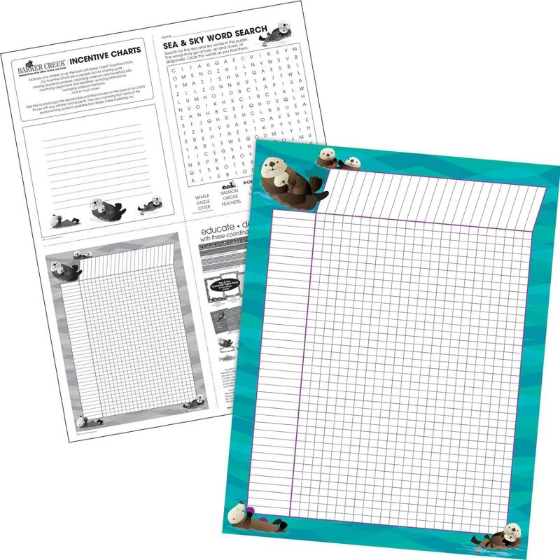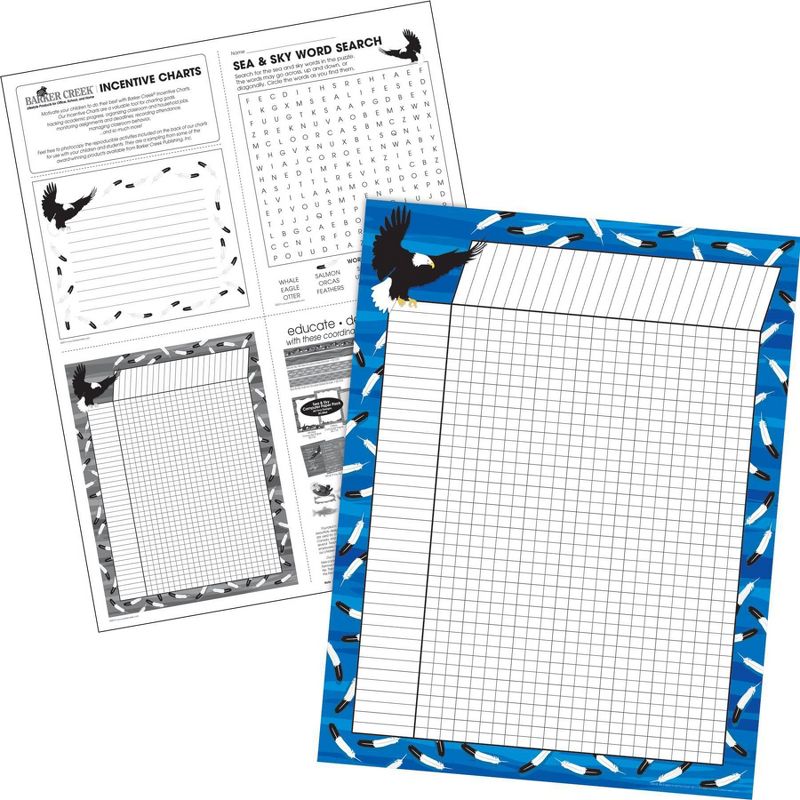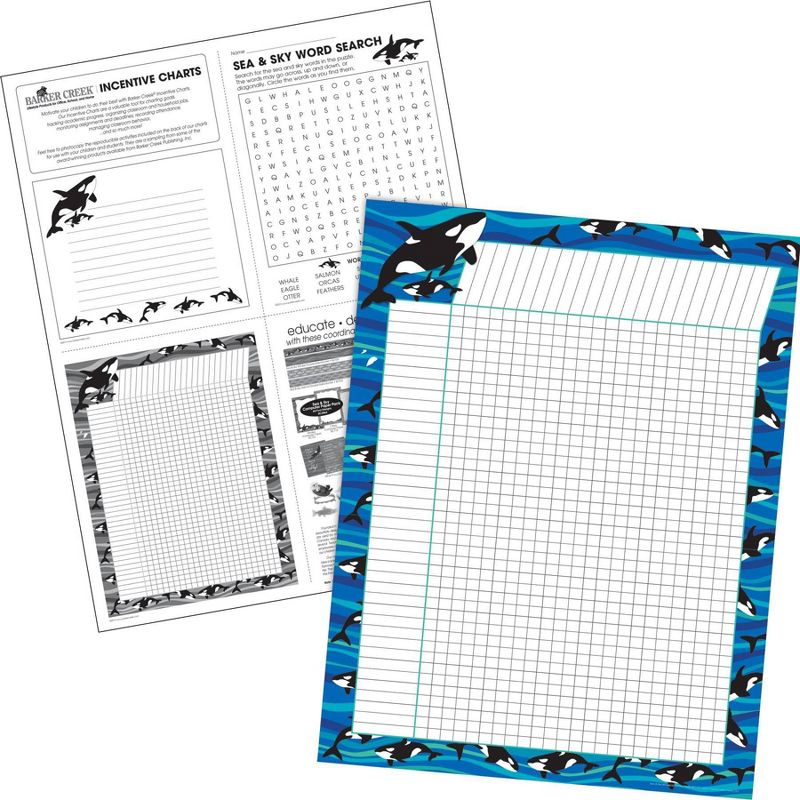 Keep progress organized in style with Barker Creek's Sea & Sky Incentive Chart Set. These colorful, ocean and sky-inspired incentive charts allow you to keep track of a student's progress or goals and encourage self-management skills. Each chart measures a generous 17" by 22" with 1/2" squares - space for 40 student names and 24 assignments! You'll find fun, reproducible activities on the back of all of four charts - orcas, salmon, otters, and salmon. Coordinates with all of Barker Creek's Sea & Sky collection.