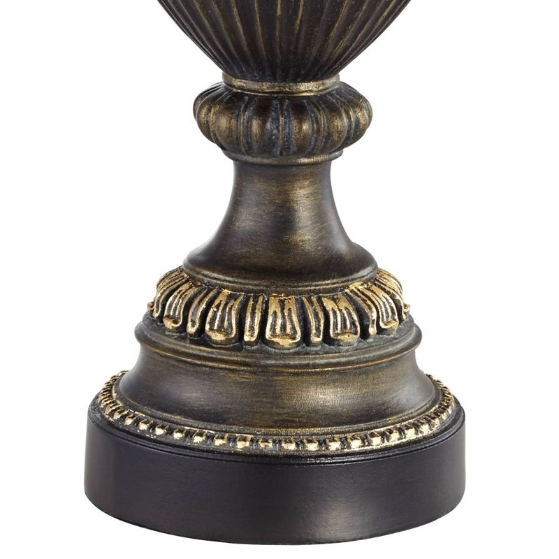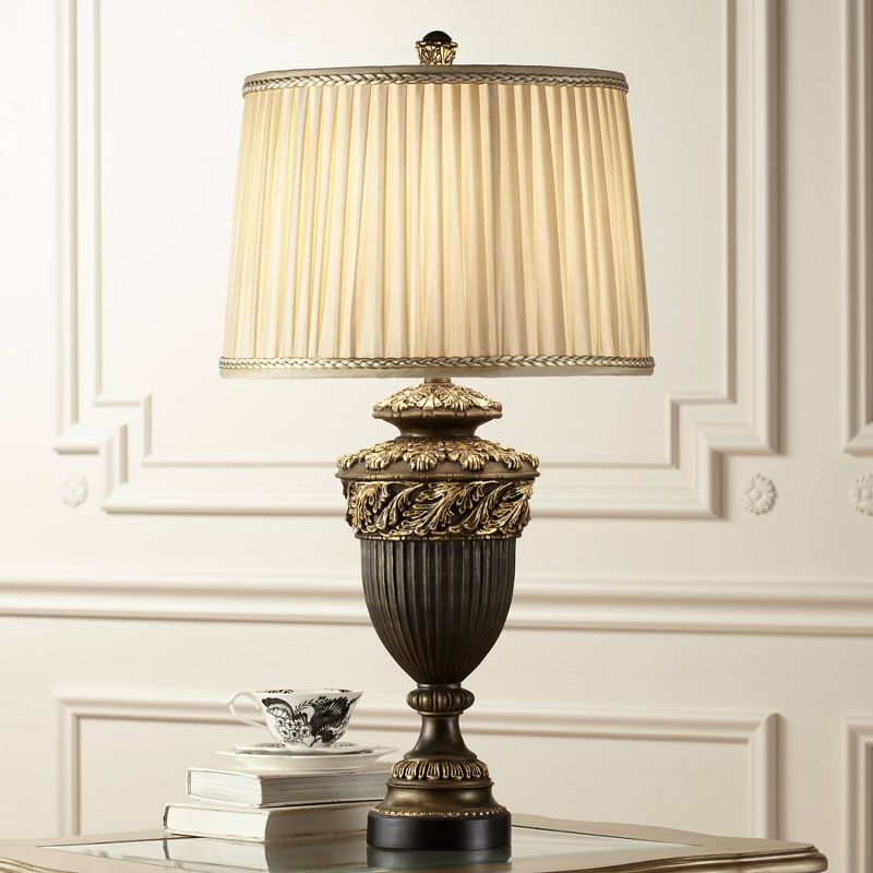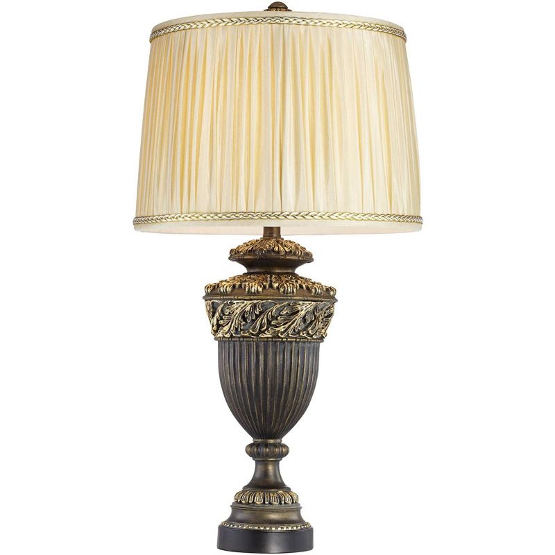 Abundant traditional details create a beautiful look in this classic urn table lamp. The warm finish in the base and body complements the loose pleated lamp shade. Braided trim along the top and bottom of the shade completes the design.