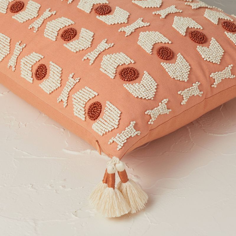 Add more colors and geometrical patterns to your decor with this Beaded Geometric Pattern Lumbar Throw Pillow from Opalhouseâ„¢ designed with Jungalowâ„¢. Showcasing a terracotta background, this lumbar throw pillow features a beautiful geometric pattern designed with red and cream beads for an artistic look. Use this terracotta lumbar throw pillow on the sofa or an armchair with geometric motif vases and wall art to add standout appeal to your home.
