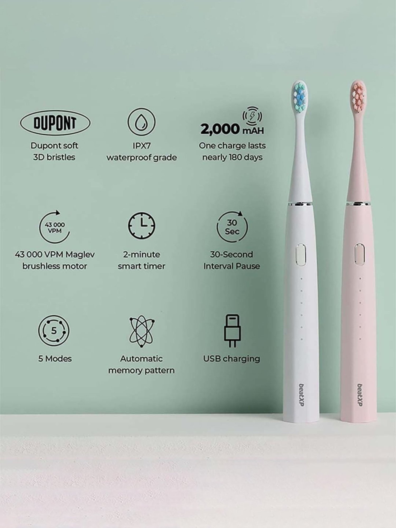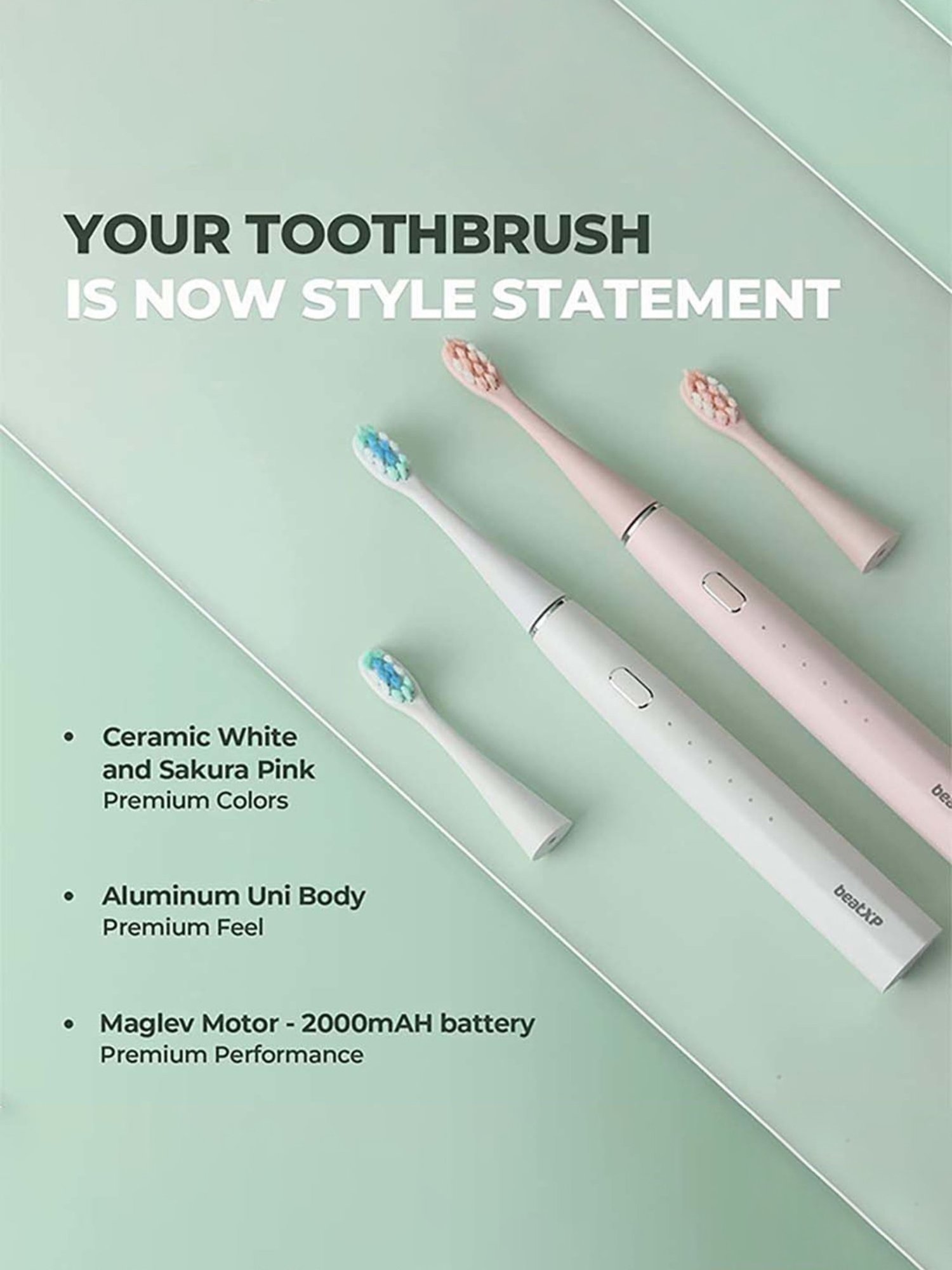 | In the Box | 1 beatXP Azure toothbrush handle, 1 Type-C charger (wall adaptor not included), 2 brush heads |