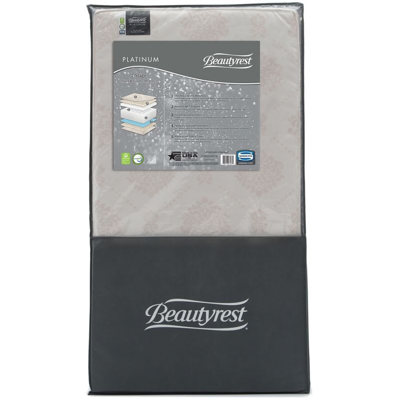 Put baby at ease each and every night with the Beautyrest Platinum 2 Stage Crib and Toddler Mattress. At the core of this mattress legendary individually wrapped coils help provide personalized support. Designed with two distinct sides to adapt to you child's needs, the infant side features a comfort layer of firm foam while the toddler side has a layer of natural, soy-enhanced foam for additional comfort and pressure point relief. The Beautyrest Platinum 2 Stage Crib and Toddler Mattress is a durable and comfortable baby mattress you can depend on for years.