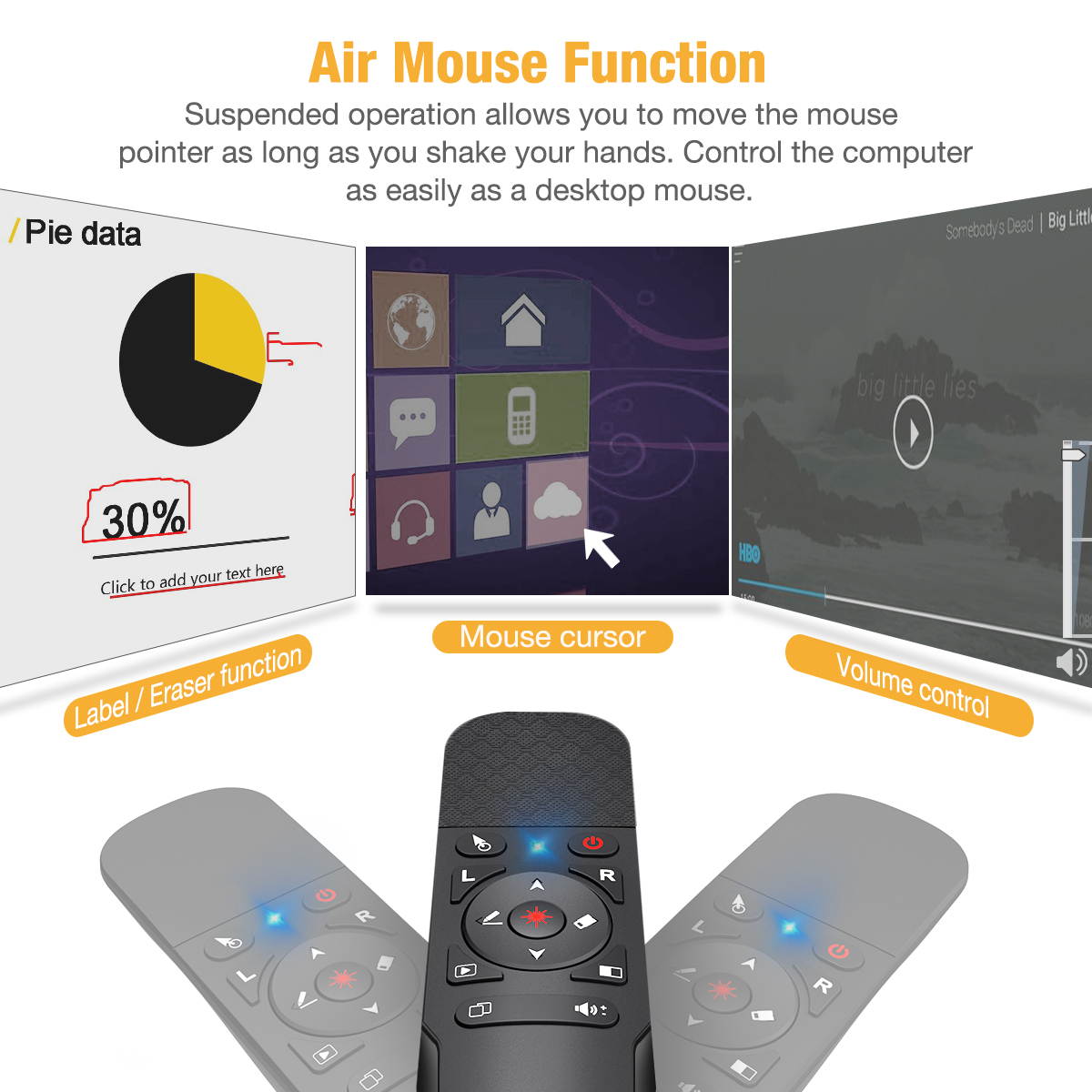 Air Mouse Presentation Clicker--Clicker for powerpoint presentations combines the function of air mouse, with wireless cursor control button and left/ right mouse button, which makes it like a true mouse. With it in your hand, you can be totally free from the constraint of keyboard and make your presentation more efficient