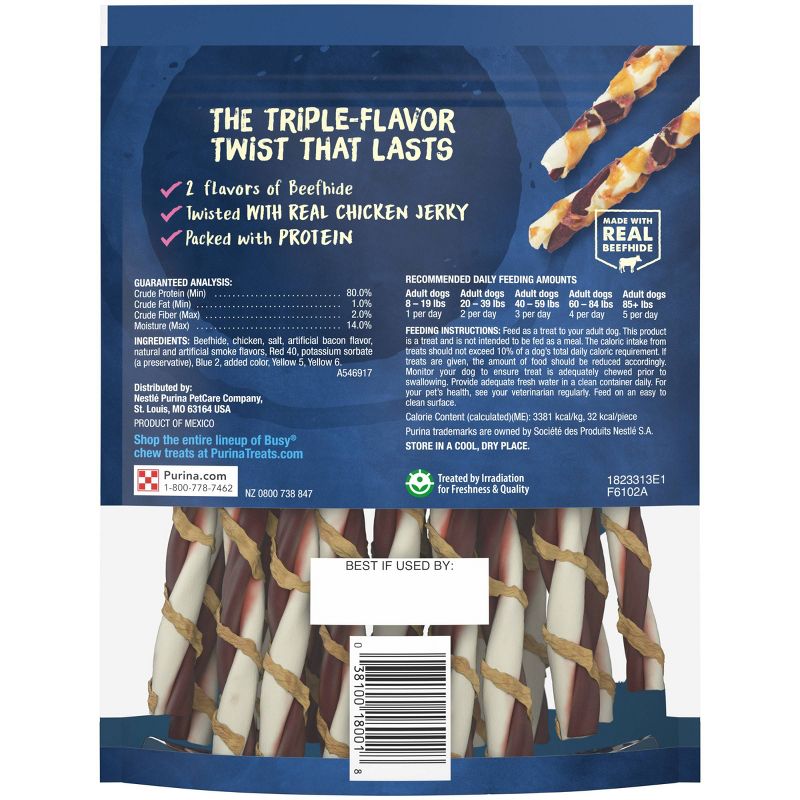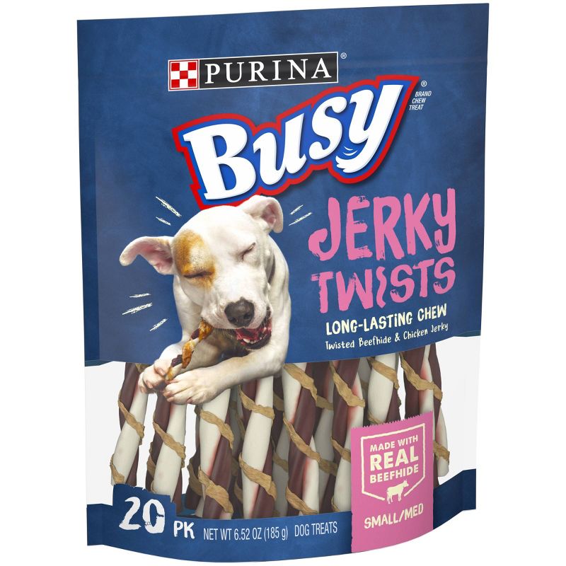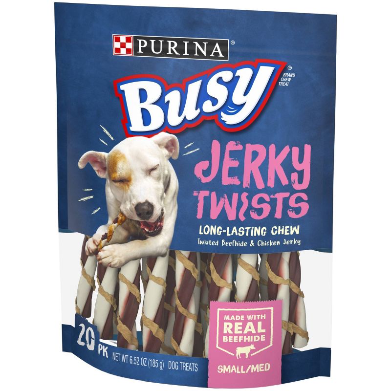 Reward your canine companion with Purina Busy Jerky Twists dog treats to provide him with the butcher shop flavors he craves. These jerky treats dog chews are made with real beefhide from farm-raised cattle, so you know he's getting only high-quality ingredients. Twisted with indulgent pieces of real chicken jerky, these treats offer a combination of tasty flavors to keep your dog interested when you don't have time to play. You can feel good every time you toss one of these grain-free treats to your dog, because they're packed with protein. These long-lasting dog chews also help keep your canine companion's teeth clean. Available in a resealable package to preserve freshness, Purina Busy Jerky Twists dog treats are designed with adult dogs in mind. Watch as your dog comes running with excitement every time you open a pouch of these delicious chews.