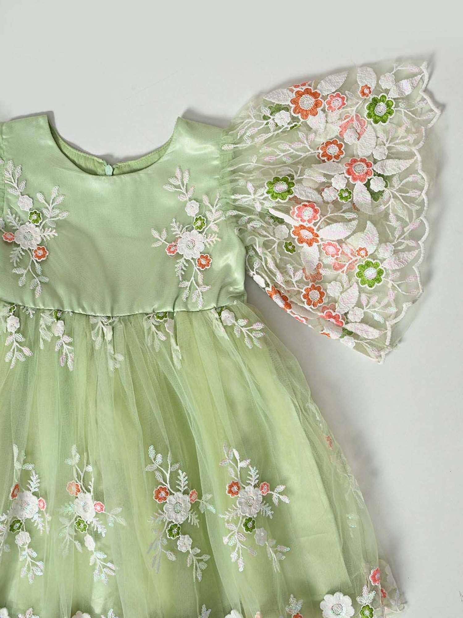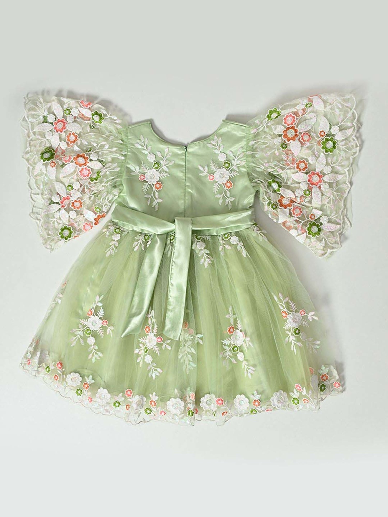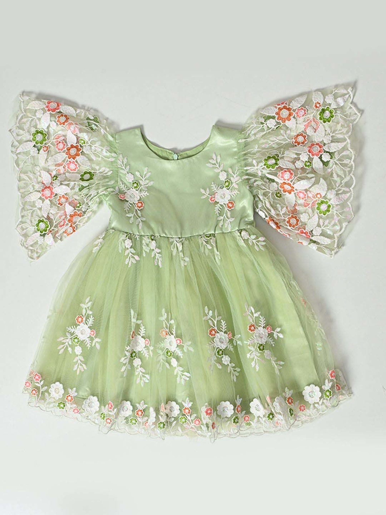 Make your little girls happy by presenting this green regular bella moda kids green self pattern dress from Bella Moda. Crafted using premium quality polyester fabric, it will be very soft to the skin. The round neck adds to its appeal. Flaunting half sleeves, it will surely keep you updated with the latest trend. The self pattern renders it fashionable.