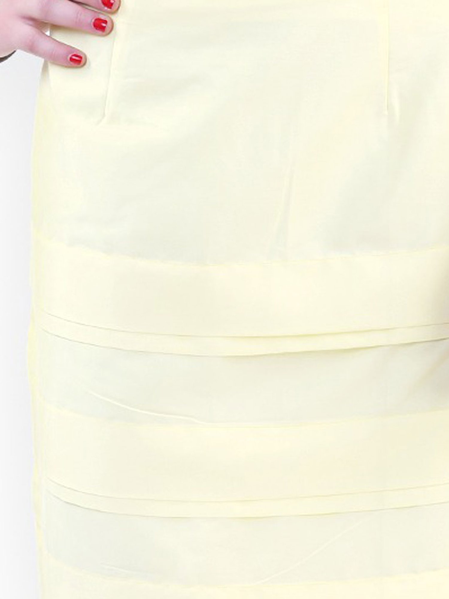 Channel smart looks in your casual wardrobe with this light yellow skirt from Belle Fille. Made from high quality fabric, this knee length skirt provide you with immense comfort throughout the day. Style this skirt with a top and wedges for a classy modish look.