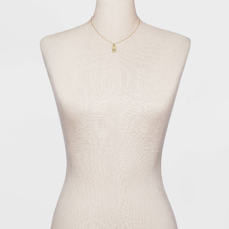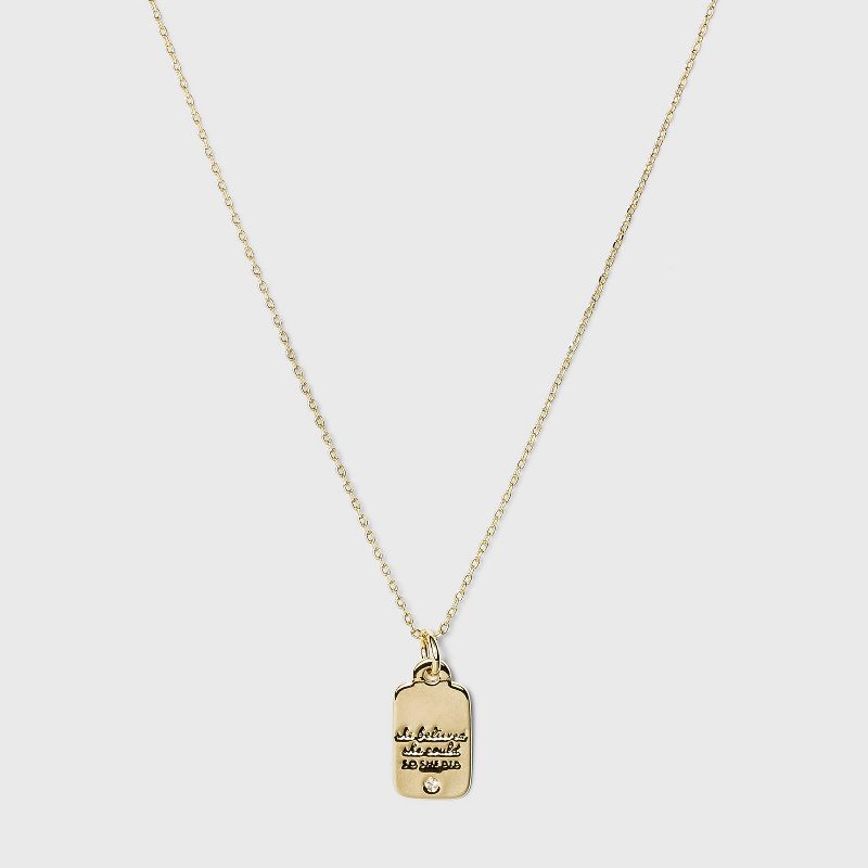 Give any outfit a perfect finishing touch with this Beloved + Inspired 'She Believed She Could So She Did' Tag Necklace. Set on a gold plated link chain at a 16-inch length, this necklace features a tag-shaped charm etched with script spelling out "She Believed She Could So She Did" and featuring a dainty rhinestone accent below the words. The necklace closes with a lobster clasp and extender chain so you can adjust the length to suit your look and the neckline of your outfit. Style it with anything from a T-shirt and jeans to a V-neck dress for versatile style you'll appreciate.