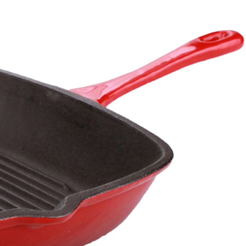 Set Includes: 11" Red cast iron fry pan and Red Steak press. The neo 11" Blue cast iron fry pan is a kitchen staple that every ambitious home chef should have handy. Grill your heart out with one of these pans, they're great for creating strong, even heat and they season as you use them. Cast iron has great heat retaining abilities and can be used on any heat source. Classic in a modern design, solid material for all your cooking needs! Oven safe up to 400Deg F. The steak press is made of heavy duty cast iron with hammered finish. Cast iron is known for its durability. The slotted steak press allows for air flow, while perfectly searing steak on each size at once. Also great for Paninis.