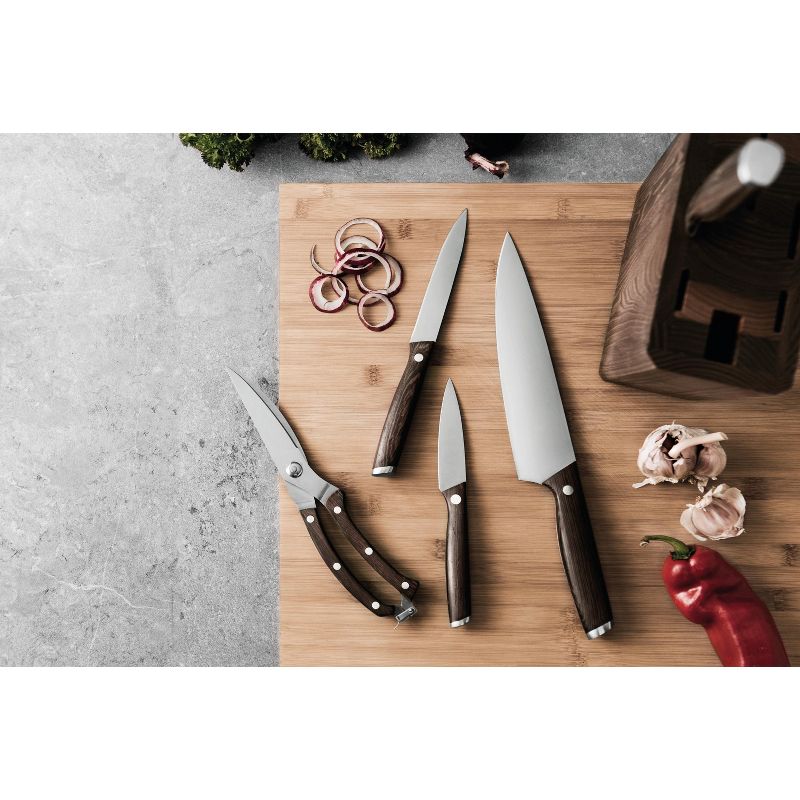 Holding a razor-sharp paring knife, utility knife, carving knife, bread knife, Chef knife and a pair of poultry shears, this stylish wooden knife block assembles 6 true kitchen essentials. Every item is equipped with a high-quality stainless steel blade as well as a crack-resistant wooden handle that offers a secure and comfortable grip. Combine this with the dark wooden knife block and you've got yourself a real eye-catcher to spruce up your kitchen counter. Set includes 1x paring knife (3 � inch), 1x utility knife (4 � inch), 1x carving knife (8 inch), 1x bread knife (8 inch), 1x Chef's knife (8 inch), 1x poultry shears (9 � inch), 1x wooden block (8 � inch)