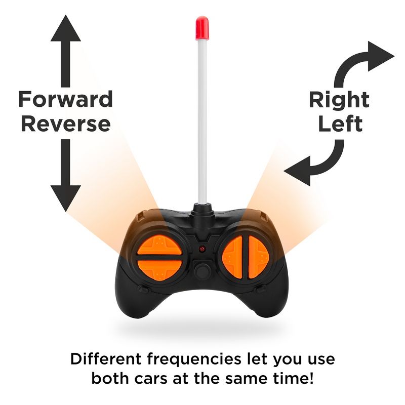 Get ready for a historic racing experience with double-trouble bumper cars! These tiny terrors have a top speed of 9 miles per hour for accurate handling and smooth turning. Designed with treaded rubber tires, front and rear bumpers, and detailed texture for an exciting experience. Different frequencies let play with use both cars at the same time; use your left hand to move your bumpers forwards and backwards and your right hand to steer left or right. Dino bumpers are 7.6cm (L) x 8.8cm (W) x 13.3cm (H), each with a 9.5cm (L) x 3.1cm (W) x 25.4cm (H) remote control.