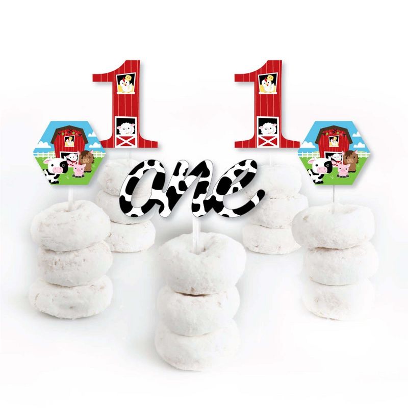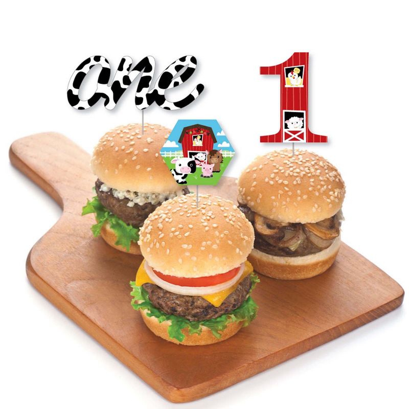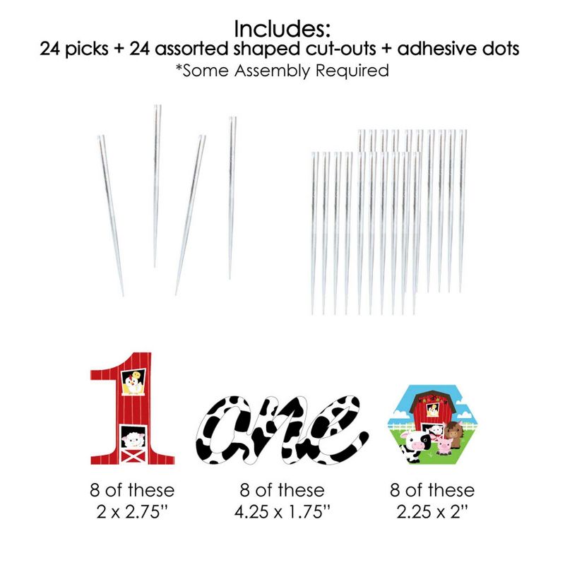 1st Birthday Farm Animals Dessert Cupcake Toppers INCLUDES 24 clear treat picks, 24 shaped paper cut outs and stickers for easy assembly. DIY 1st Birthday Farm Animals cupcake supplies are perfect for a barnyard first birthday party. Plastic clear treat pick SIZE 4 inches tall with the completed height of the 1st Birthday Farm Animals Dessert Cupcake Topper depending on where the plastic pick is attached to the shaped paper cut out. Cupcake toppers are perfect for standard cupcakes and can also be added to appetizers and individual servings of other sweet treats such as brownies or donuts, and even used to create small fruit kabobs. EASY PARTY DECORATIONS: 1st Birthday Farm Animals picks make it easy to style a barnyard 1st birthday theme party. Create impressive cupcake towers with decorated treats placed on a tiered stand at the candy buffet table, style adorable tables with individual cupcakes at each place setting, or make creative centerpieces using decorated treats and a coordinating treat stand. PREMIUM PARTY SUPPLIES: Clear treat picks are made of food-grade plastic and packaged in a food-safe environment. The 1st Birthday Farm Animals paper cut out toppers are professionally printed on heavy-duty cardstock paper with themed art on one side and a coordinating pattern on the back. Cut outs will quickly attach to the clear dessert pick and then easily insert into your party appetizers or desserts. EASY ASSEMBLY INSTRUCTIONS INCLUDED: Clear treat picks and 1st Birthday Farm Animals shaped cutouts will ship with easy assembly instructions to create unique dessert cupcake toppers.