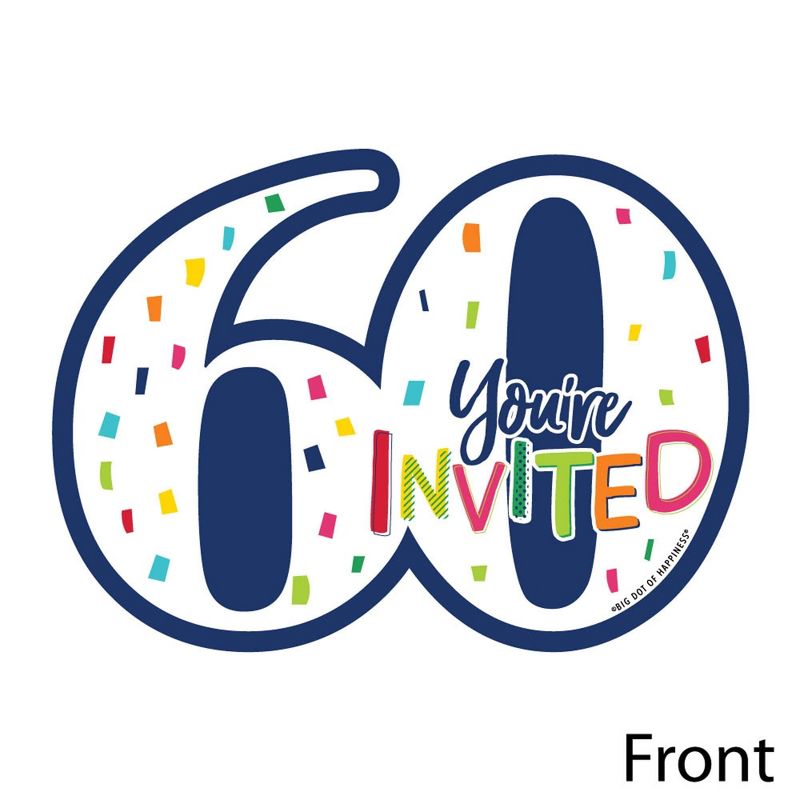 60th Birthday - Cheerful Happy Birthday Fill-In the Blank Invitation Set INCLUDES 12 sixty shaped party invitations and 12 premium white envelopes. 60th Birthday - Cheerful Happy Birthday fill-in invitation is perfect for any event. The rainbow theme is great for a birthday party. Sixty shaped party invitations SIZE 7 inches by 5 inches. The included envelopes measure 5 inches by 7 inches. The back of each 60th Birthday - Cheerful Happy Birthday party invitation has space to add your party details: For: Date: Time: Place: Given By: RSVP: PREMIUM PARTY INVITATIONS: Sixtieth party invitation are professionally printed on heavy-duty card stock paper with a photo-like shine. They are individually inspected, then carefully packaged with our exclusive squiggle flap envelopes, making this 60th Birthday - Cheerful Happy Birthday stationary set a must-have for any birthday party. MADE IN THE USA: 60th Birthday - Cheerful Happy Birthday - Shaped Fill-In Invitations are designed and manufactured at our Wisconsin facility using materials that are Made in the USA.