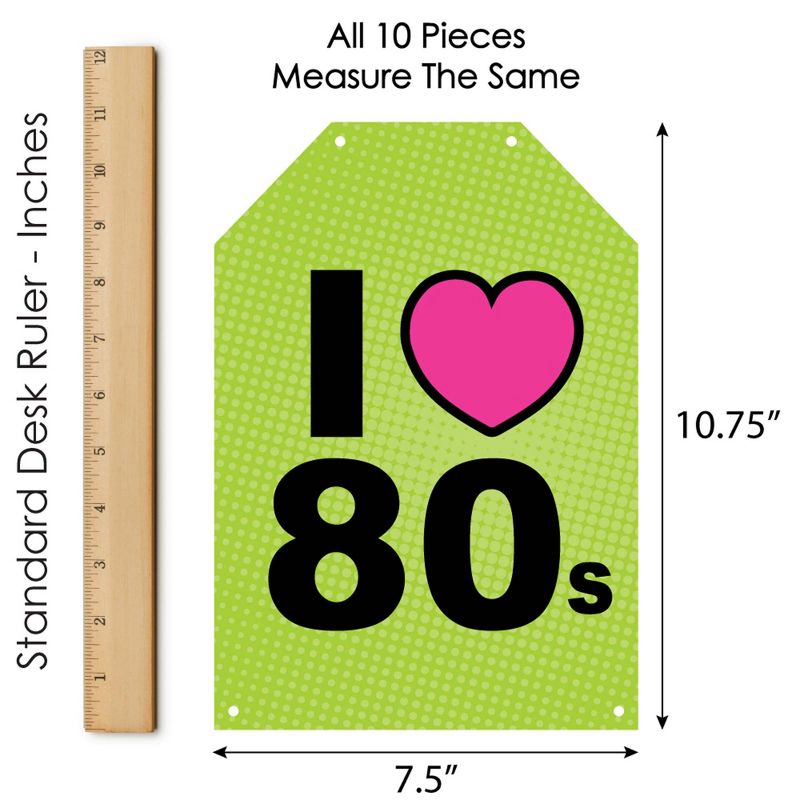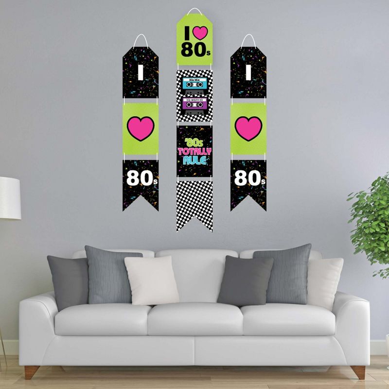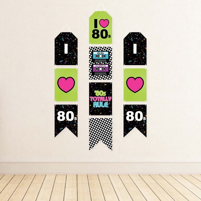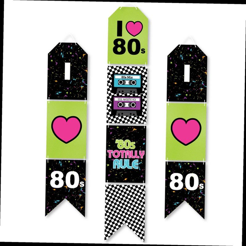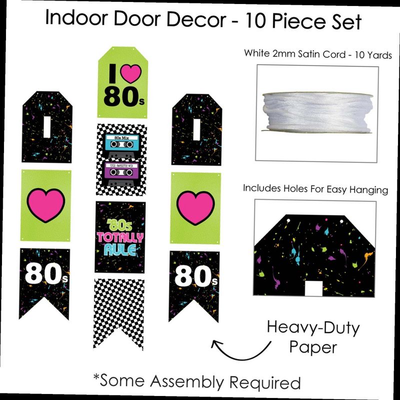 80's Retro Indoor Door Decor INCLUDES: 10 heavy-duty paper pieces to create 3 vertical banners and 10 yards white 2mm satin cord. Easy assembly required. FUN PARTY BANNER: Vertical hanging door banners will create that wow-factor at your totally prom, homecoming or birthday party. Hang at the entrance of your event, over the food or gift table, or any open wall space to create a fun focal point. WALL DECORATION KIT: All banner sign pieces SIZE 7.5 inches wide x 10.75 inches. Each piece has pre-cut holes for easy DIY hanging with the included 10 yards of white 2mm satin cord. This DIY banner decor kit allows you to choose the spacing between each piece and string the cording through at your desired length. Clear adhesive stickers are also included to secure cording onto the back of each banner piece. PREMIUM PARTY SUPPLIES: 80's Retro hanging vertical door banner decoration pieces are professionally printed one-sided on heavy-duty cardstock paper. Each banner piece is individually inspected and carefully packaged by hand. Rock star wall decoration kit requires some easy assembly. Follow the number sequence on the back of each banner piece and simply string the included cording through the pre-cut holes. MADE IN THE USA: 80's Retro paper door banner decoration kit is designed and manufactured at our Wisconsin facility using materials that are Made in the USA.