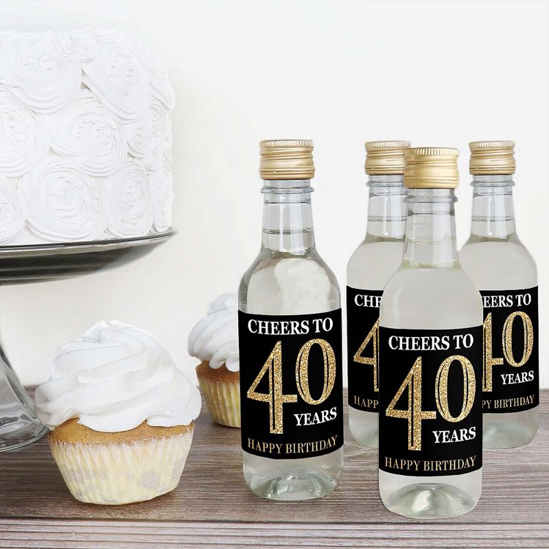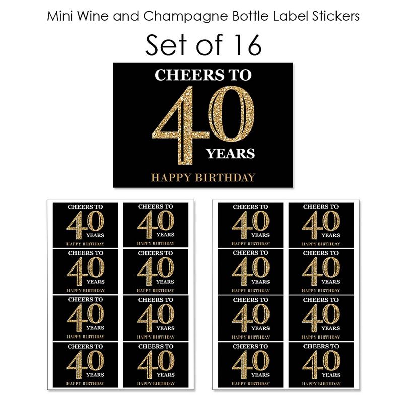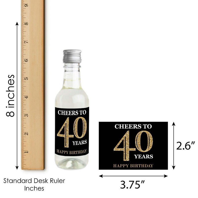 Adult 40th Birthday - Gold Mini Wine and Champagne Bottle Labels INCLUDES Set of 16 fortieth bday single-serve bottle sticker labels in the Adult 40th Birthday - Gold theme, perfect for a birthday party favor gift. Mini wine and champagne bottle label each SIZE 3.75 inches wide x 2.6 inches tall to fit small, single-serve bottles. EASY TO USE: Prepare your beverage bottles by ensuring they are room temperature. Removing the original bottle label is not necessary. Carefully peel one adhesive Adult 40th Birthday - Gold Mini Wine Bottle Label from the backing and adhere to a bottle, starting at the left edge and rolling to the opposite edge. Press down to smooth. HIGH QUALITY PARTY FAVORS: Adult 40th Birthday - Gold mini wine and champagne bottle labels are professionally printed on a sticker paper with a glossy coating. They are waterproof and can be used on bottles that will be chilled, just be sure to apply prior to chilling. Add them single-serve bottles at each place setting for an impressive, coordinated birthday party favor gift. UNIQUE GIFT IDEA: Adult 40th Birthday - Gold Mini Wine Bottle Labels also make a great gift idea. Add Mini Wine and Champagne Bottle Label Stickers to a variety of single-serve wine and spirits bottles for a special gift or party game winner prize. Wine bottle labels will easily give your birthday party a personal touch! MADE IN THE USA: Adult 40th Birthday - Gold Mini Wine and Champagne Bottle Label Stickers are made at our Wisconsin facility using materials that are Made in the USA. Please Note: Mini bottles in image are not included. Mini Wine and Champagne Bottle Labels No-Mess Glitter Print: Our beverage labels are designed with a printed image of glitter, eliminating glitter flake while maximizing bling effect!