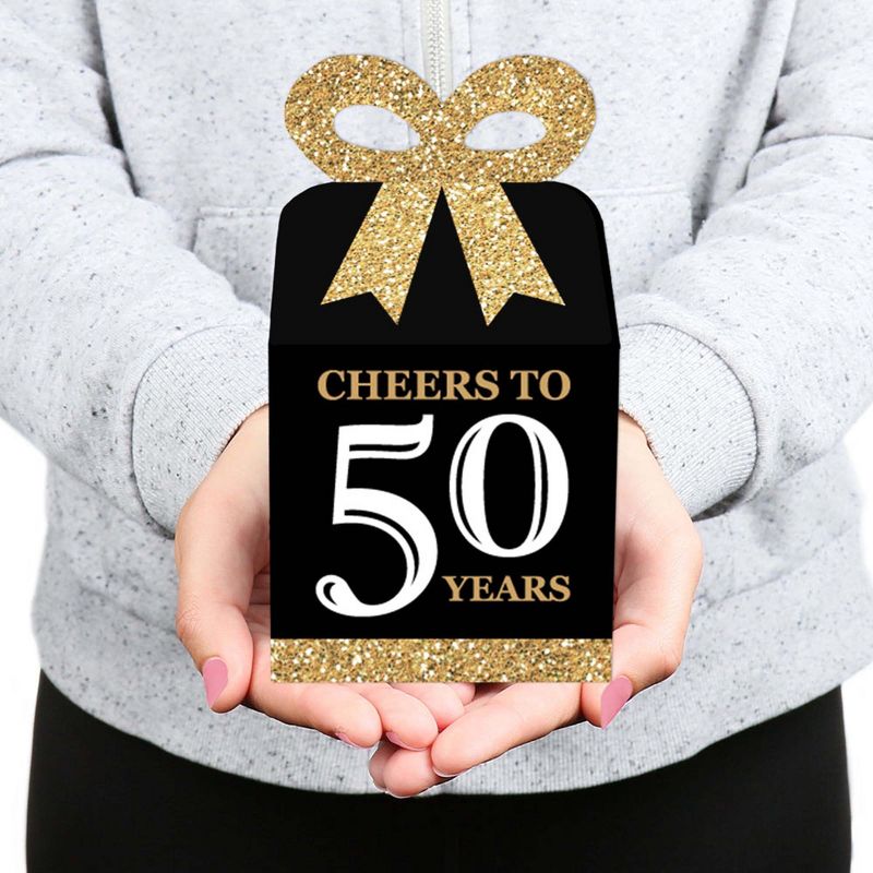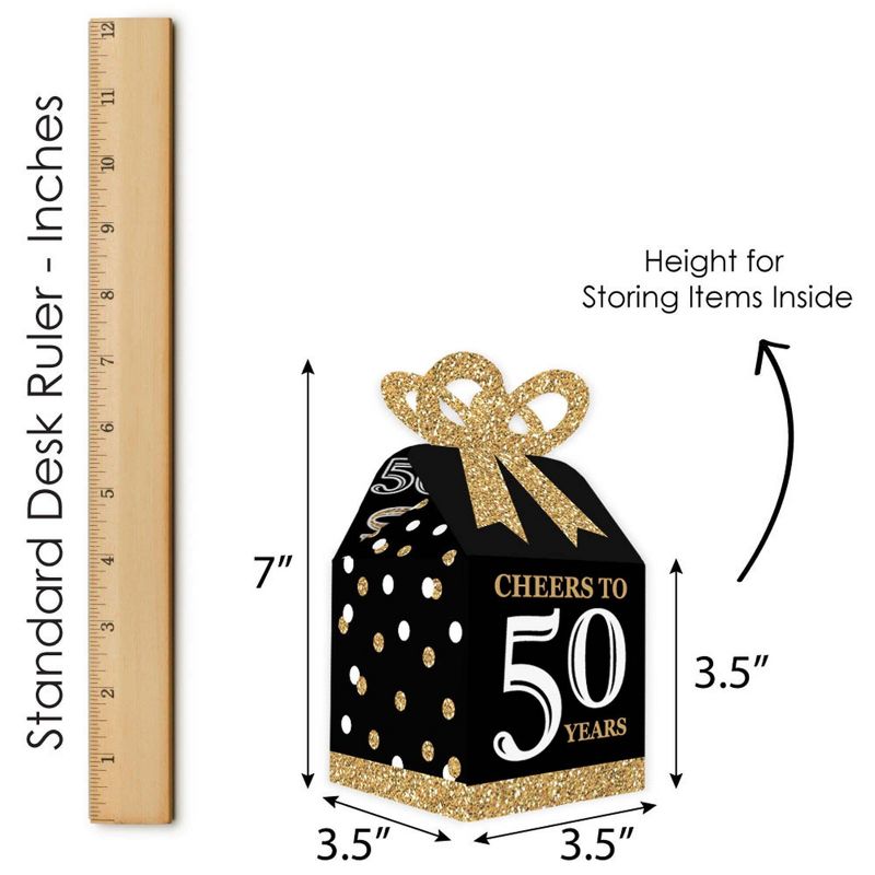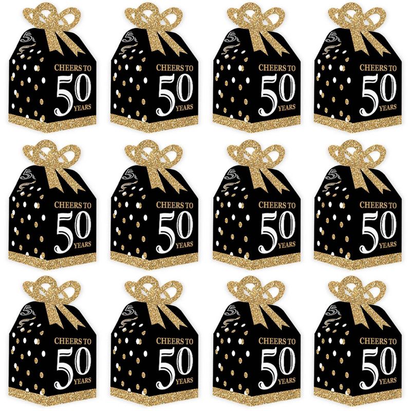 Bow Boxes INCLUDE: 12 Adult 50th Birthday - Gold-themed square favor gift boxes. Each box SIZE measures 3.5 inches length x 3.5 inches width x 7 inches height. Bow boxes are ideal for small gifts and treats that are under 3.5 inches tall (height for storing items in closed box). When assembled and closed, each box creates a 3D paper bow-shaped top with a square bottom. CUTE GIFT BOXES: This small, closed favor box can be filled with homemade treats (fun cupcake box), party trinkets, or thank you gifts. At the party, have each guest fill their Adult 50th Birthday - Gold bow box with snacks from a candy buffet or use as a party loot box. Guests will have fun guessing what surprise each favor gift box contains. PREMIUM PARTY SUPPLY: Bow boxes are professionally printed and double-sided on heavy-duty cardstock paper, with a photo-like shine. They are hand-folded, individually inspected, and then carefully packaged. EASY ASSEMBLY: Adult 50th Birthday - Gold bow boxes will arrive flat. Each bow box has crease lines and numbered tabs for easy folding. Finish the DIY assembly by interlocking top of box to create a three-dimensional bow. Packaging will include assembly instructions. MADE IN THE USA: Adult 50th Birthday - Gold Birthday Party bow boxes are designed and manufactured at our Wisconsin facility using materials that are Made in the USA. Adult 50th Birthday - Gold bow boxes use a No-Mess Glitter Print: Our DIY favor boxes are designed with a printed image of glitter, eliminating glitter flake while maximizing bling effect!