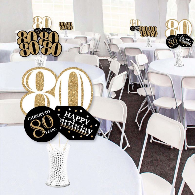 Adult 80th Birthday - Gold Showstopper Table Toppers INCLUDE: 35 heavy-duty paper centerpiece cut-outs in our Adult 80th Birthday - Gold theme. Each cut-out shape is printed double-sided and includes 35 wooden dowel sticks. DIY assembly is required. EASY TABLE DECORATIONS: Adult 80th Birthday - Gold showstopper party centerpieces come with a variety of fun shapes and in the perfect sizes to create impressive tabletop decorations. Place assembled centerpiece sticks into jars or floral arrangements for that showstopper wow-factor. DIY PARTY CENTERPIECES: Adult 80th Birthday - Gold party centerpiece kit arrives with wooden dowels and reinforcing stickers for easy DIY assembly. Simply press the included reinforcing sticker onto one dowel stick, near the end of dowel. Then, firmly press dowel to the back of a table topper shape. HIGH-QUALITY PARTY SUPPLIES: Adult 80th Birthday - Gold showstopper table toppers are professionally printed double-sided on sturdy cardstock paper with a photo-like shine. They are individually inspected and carefully packaged by hand. Showstopper table toppers will arrive unassembled, leaving your DIY birthday party idea options endless. MADE IN THE USA: Adult 80th Birthday - Gold showstopper table toppers are designed and manufactured at our Wisconsin facility using materials that are Made in the USA. Adult 80th Birthday - Gold centerpieces decorations use a No-Mess Glitter Print: Our table topper decorations are designed with a printed image of glitter, eliminating glitter flake while maximizing bling effect!