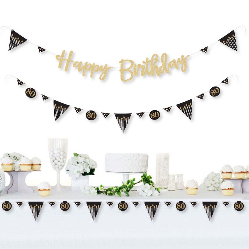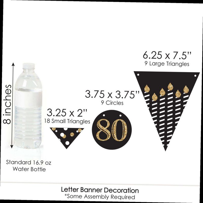 Adult 80th Birthday Party Letter Banner Decoration INCLUDES Happy Birthday letters, 36 banner pennant pieces and cord for hanging. Adult 80th Gold birthday party banners look great at any venue! VARIETY OF DESIGNS & SIZES! Adult 80th Birthday Party Letter Banner features coordinating pennant pieces and script letters. Decorate your event with 9 large triangle pennants (6.25" x 7.5"); 9 circle pennants (3.75" x 3.75"); 18 small triangle pennants (3.25" x 2"); and no-mess real glitter Happy Birthday letters in script style lettering. Easily string them together with the included 10 yards of satin cording. BIRTHDAY PARTY DECORATIONS: An Adult 80th Birthday Party - Gold Bunting Banner is an easy way to decorate for your party and bring your birthday theme to life. Hang at the entrance of your birthday party, over the food table or candy buffet, and even by the gift table. PREMIUM BIRTHDAY PARTY SUPPLIES: Adult 80th Birthday Party Letter Banner is professionally printed on sturdy cardstock paper. Each pennant is individually inspected then carefully packaged by hand. Happy Birthday letter banners require some easy assembly. Simply string the cord through the holes on each letter piece and add triangle and circle pennants to complete the banner. Create multiple rows by cutting the cord to your desired length or hang as one long banner. Adult 80th Birthday - Gold - Birthday Party Letter Banner Decoration Pennants Use A No-Mess Glitter Print: Our pennant pieces are designed with a printed image of glitter, eliminating glitter flake while maximizing bling effect!