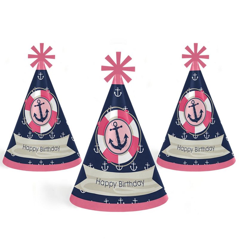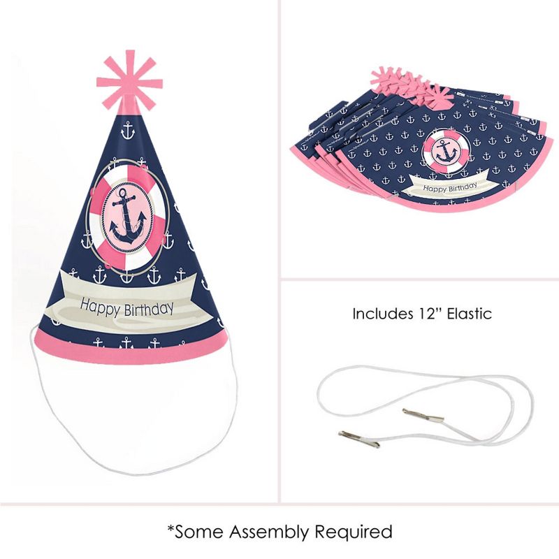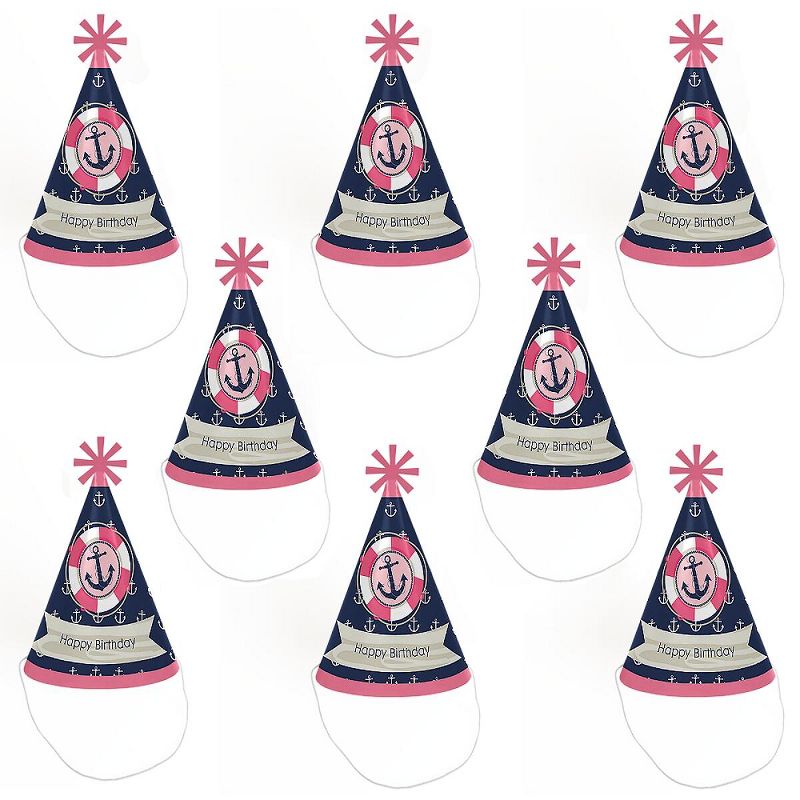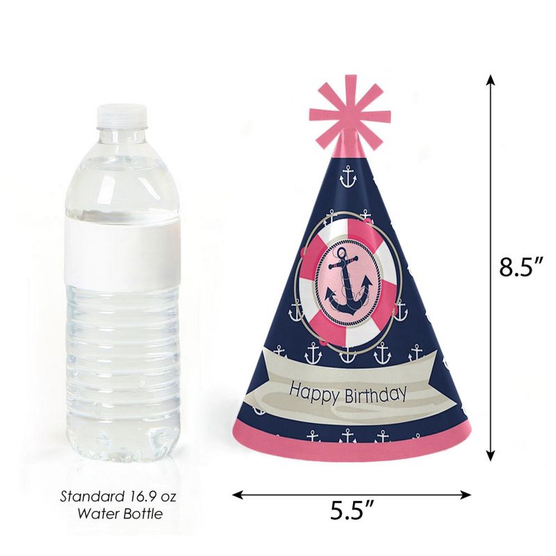 Ahoy - Nautical Girl Party Hats INCLUDES 8 cone-shaped pink nautical party hats for adults with decorative top and elastic chin straps. Ahoy - Nautical Girl party hats are a larger size but will fit both children and adults. Some easy and quick assembly required. Ahoy - Nautical Girl hats SIZE 8.5 inches tall and 5.5 inches in diameter at the base. The included elastic chin straps measure 12 inches long. Each of these fun girl nautical party hats feature a unique star cut-out decoration at the top and printed "Happy Birthday" on the front. FUN BIRTHDAY PARTY SUPPLIES: Ahoy - Nautical Girl cone party hats are perfect for your pink nautical party. This set of cute party hats will help you take memorable party photos. They are sure to be enjoyed by all your friends and family - and the guest of honor! PREMIUM PARTY HATS: Set of 8 Ahoy - Nautical Girl party hats are professionally printed on heavy-duty cardstock paper with a photo-like shine. They are individually inspected, then carefully packaged. Ahoy - Nautical Girl cone party hats will arrive flat. Easy assembly is required. Easy assembly is required. Simply roll the party hat into a cone shape, slide the tab into the slot to secure cone shape, and then attach the elastic strap. MADE IN THE USA: Ahoy - Nautical Girl - Cone Birthday Party Hats are designed and manufactured at our Wisconsin facility using materials that are Made in the USA.