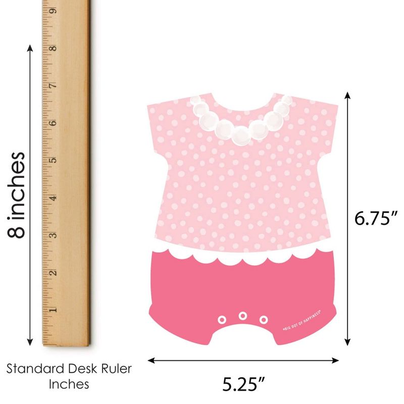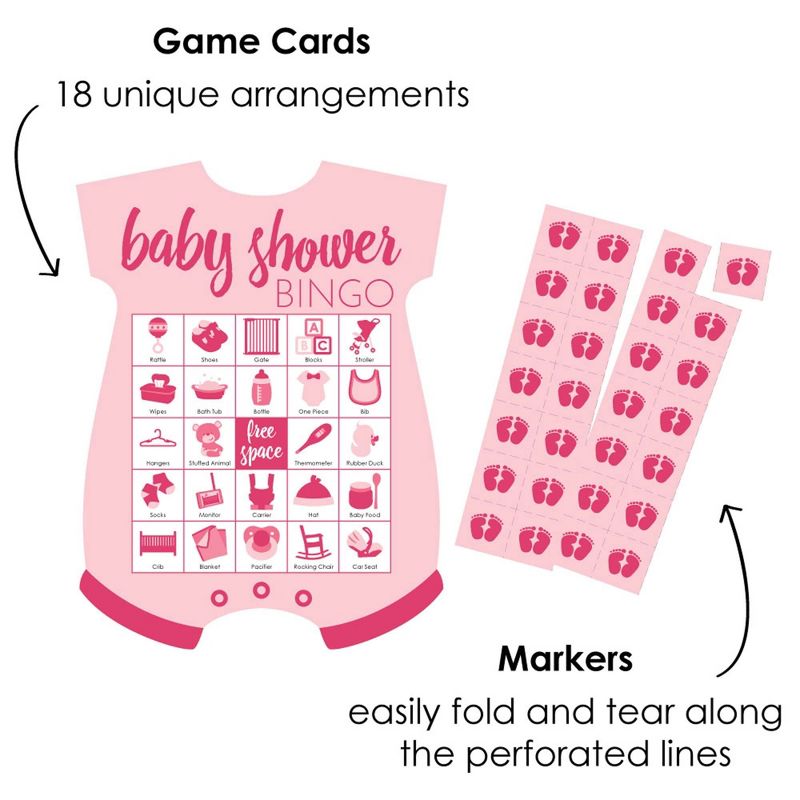 Baby Girl - Shaped Picture Bingo Cards and Markers INCLUDES: 18 game cards, 18 perforated marker sheets, 1 perforated call sheet, and game instructions. MUST-HAVE PARTY SUPPLY: Bingo is an easy and classic baby shower game that everyone will have fun playing. Baby Girl - Shaped Picture Bingo Cards and Markers give this classic game a fresh look with baby bodysuit-shaped playing cards and baby related pictures instead of numbers. HOW TO PLAY: Begin play by the designated bingo leader pulling a caller chip from the bowl. Each guest covers the called picture on their card with square marker. Continue until a guest has covered a row of pictures in any direction - vertically, horizontally, or diagonally and calls out "BINGO!". HIGH-QUALITY: Baby Girl Picture Shaped Bingo Cards and Markers are professionally printed and double-sided on sturdy cardstock paper. They are individually inspected and carefully packaged by hand. Each baby bodysuit-shaped card measures 5.25" Wide x 6.75" Tall, perforated marker sheets measure 2.75" Wide x 5" Tall and individual markers measure 0.75" Wide x 0.75" Tall. MADE IN THE USA: Baby Girl - Shaped Bingo Cards and Markers are designed and manufactured at our Wisconsin facility using materials that are Made in the USA.