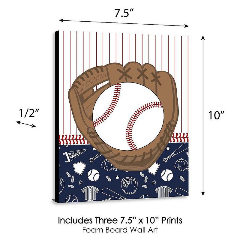 Batter Up- Baseball Wall Art Set INCLUDES 3 ready-to-hang baseball themed panels and non-marking wall mounts for easy hanging. Batter Up- Baseball artwork is perfect for a nursery, kids room or playroom. Batter Up- Baseball Wall Art & Kids Room Decor SIZE each 10 inches high x 7.5 inches wide x .5 inches thick. Baseball lightweight art prints will arrive ready to use - no frame needed. The black edge gives each print a modern, finished look. EASY TO HANG: Simply attach a non-marking wall mount (included) to each corner of a Batter Up- Baseball art panel and press to hang in desired location. Wall mounts are repositionable, so you can redesign your artwork display at any time. PREMIUM HOME DECOR: 3-piece Batter Up- Baseball Wall Art Set is professionally printed on thick material with a black edge. You will not need to frame this set of baseball room decor. Each standout print is ready to hang and will add a contemporary touch to any room. MADE IN THE USA: Batter Up- Baseball Wall Art & Kids Room Decor is designed and manufactured at our Wisconsin facility using materials that are Made in the USA.