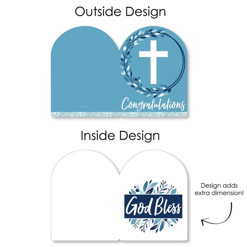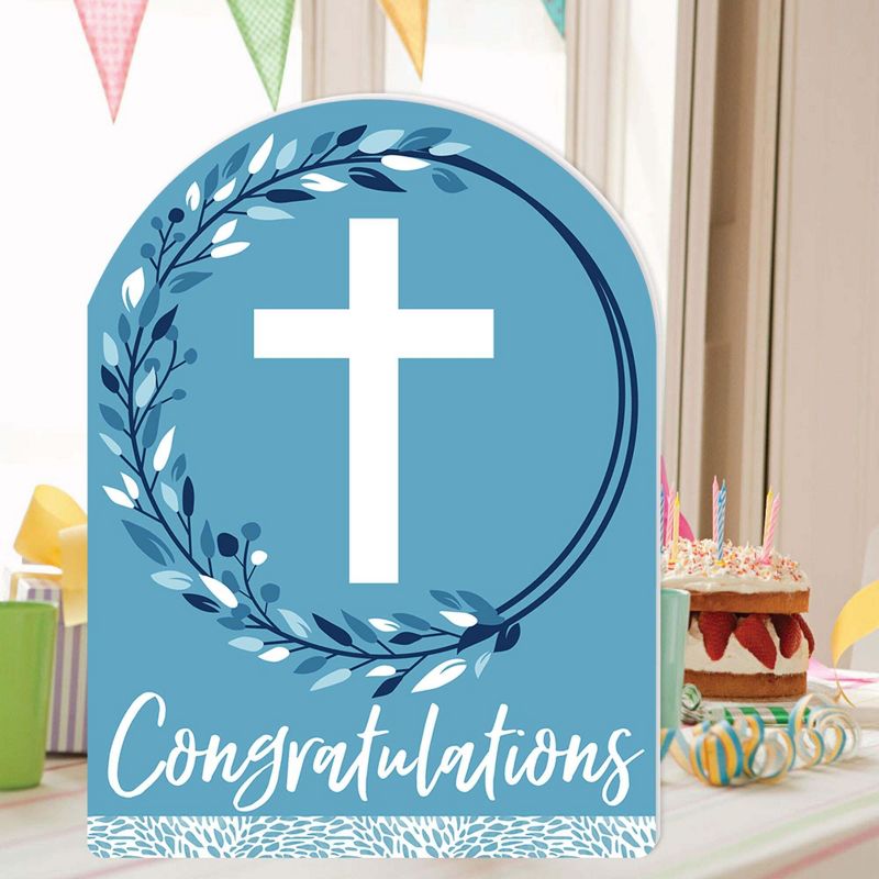 Blue Elegant Cross Jumborific Card INCLUDES 1 giant greeting card made of corrugated plastic. Say a big congratulations to show your religious congratulation with an oversized card. GIANT GREETING CARD: Front of card reads "Congratulations". Open card to "God Bless" message that is layered for extra dimension. Left side of inside will be blank with lots of room to handwrite personal messages. RELIGIOUS CARD: Wow a friend, loved one, or coworker when you gift a Jumborific Card. The thick and sturdy plastic gives this card a unique display when in standing position and to be used for a memorable keepsake. HIGH-QUALITY PARTY GIFT: Blue Elegant Cross Jumborific Card SIZE 16.5 inches wide (folded) x 22 inches tall. This giant greeting card is professionally printed on heavy-duty corrugated plastic with white edges. MADE IN THE USA: Big shaped Jumborific Card is designed and manufactured at our Wisconsin facility using materials that are Made in the USA.