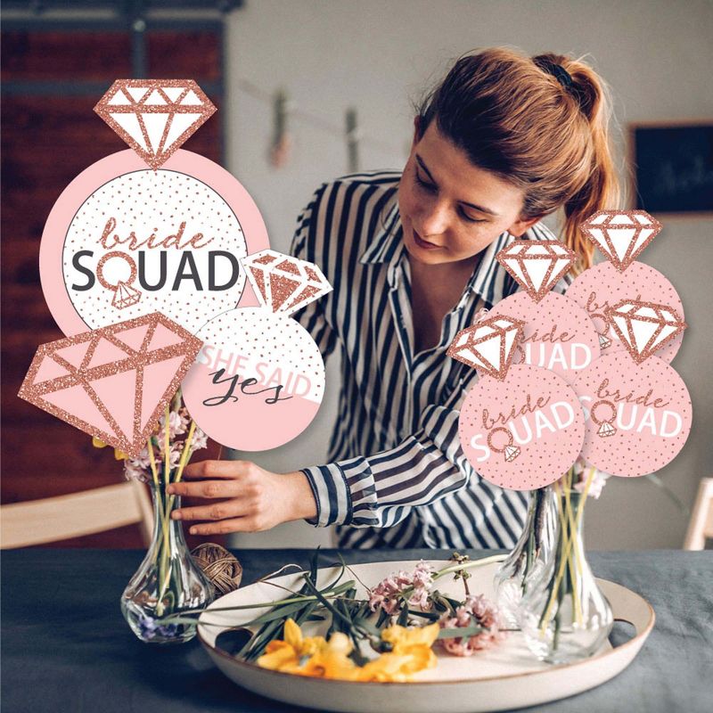 Bride Squad Showstopper Table Toppers INCLUDE: 35 heavy-duty paper centerpiece cut-outs in our Bride Squad theme. Each cut-out shape is printed double-sided and includes 35 wooden dowel sticks. DIY assembly is required. EASY TABLE DECORATIONS: Bride Squad showstopper party centerpieces come with a variety of fun shapes and in the perfect sizes to create impressive tabletop decorations. Place assembled centerpiece sticks into jars or floral arrangements for that showstopper wow-factor. DIY PARTY CENTERPIECES: Bride Squad party centerpiece kit arrives with wooden dowels and reinforcing stickers for easy DIY assembly. Simply press the included reinforcing sticker onto one dowel stick, near the end of dowel. Then, firmly press dowel to the back of a table topper shape. HIGH-QUALITY PARTY SUPPLIES: Bride Squad showstopper table toppers are professionally printed double-sided on sturdy cardstock paper with a photo-like shine. They are individually inspected and carefully packaged by hand. Showstopper table toppers will arrive unassembled, leaving your DIY bridal shower or bachelorette party idea options endless. MADE IN THE USA: Bride Squad showstopper table toppers are designed and manufactured at our Wisconsin facility using materials that are Made in the USA. Bride Squad centerpieces decorations use a No-Mess Glitter Print: Our table topper decorations are designed with a printed image of glitter, eliminating glitter flake while maximizing bling effect!