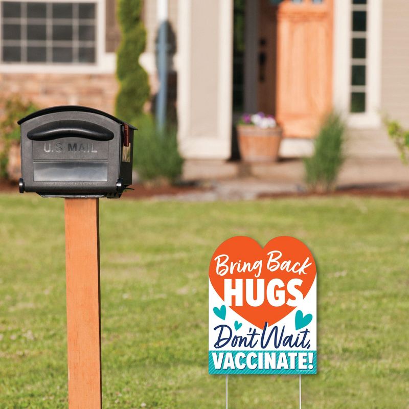 Bring Back Hugs Yard Sign INCLUDES: 1 weather resistant plastic sign and 2 sturdy metal stakes for displaying. Show your neighbors and pedestrians when you add this eye-catching sign to your property. PERFECT FOR ANY LOCATION! This 1-piece yard sign SIZE 10.75 inches wide x 13.75 inches tall is the ideal height to display in the front yard of your home. If displayed outdoors, yard sign rules and regulations vary from city and state, we recommend checking your local guidelines. EASY TO USE: Bring Back Hugs Lawn Sign is professionally printed and cut, making assembly quick and easy. Simply insert the included two heavy-duty metal stakes into the sign and press into the ground to display. HIGH-QUALITY YARD DECORATION: Bring Back Hugs Yard Sign is professionally printed on durable, corrugated plastic. Bring Back Hugs Don't Wait, Vaccinate yard sign is waterproof and can be used outdoors – displayed in wind, snow, and rain without any worry. MADE IN THE USA: Bring Back Hugs Yard Sign is designed and manufactured at our Wisconsin facility using materials that are Made in the USA.