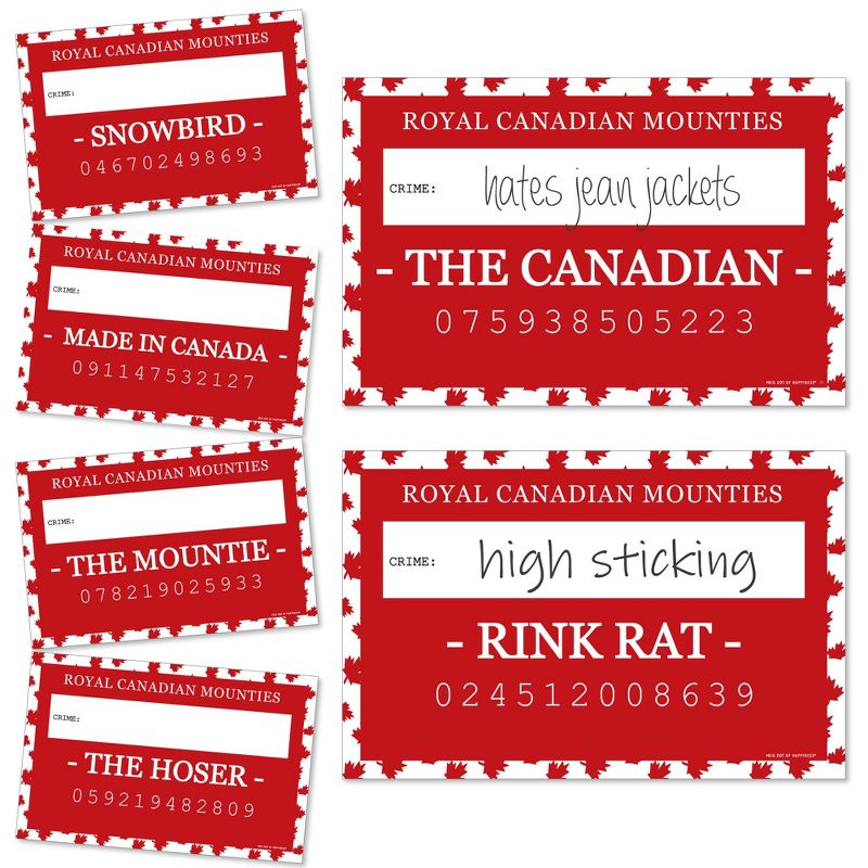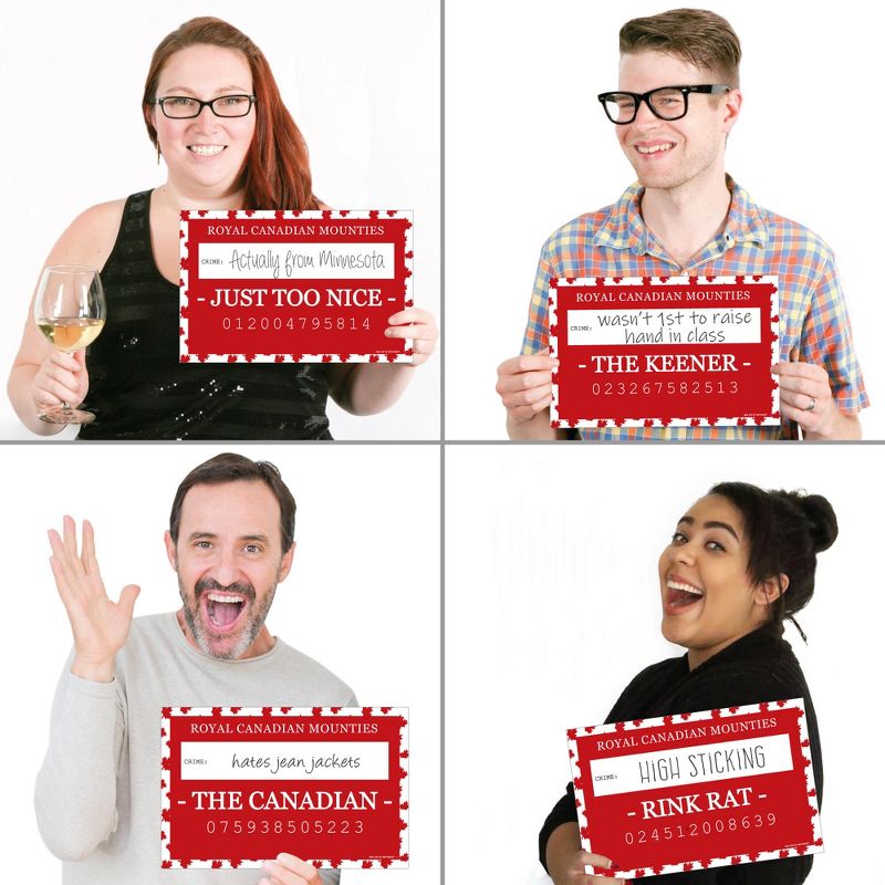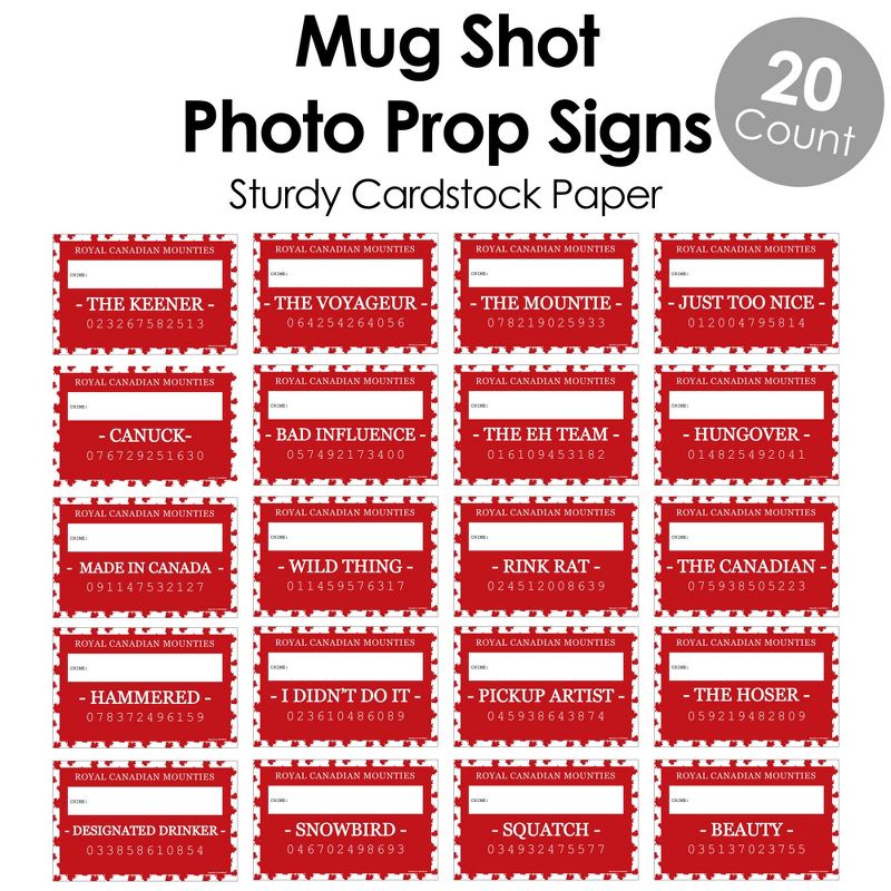 Mugshot Photo Booth Props INCLUDES 20 Canada Day mugshot signs with unique crime prompts and space to write in the individual "crime." Take entertaining and shareable Canada party photos of your friends and family while making memories with funny Canada Day mug shot photo booth props! PERFECT FOR ANY CROWD! Funny mug shot photo booth signs include crime prompts for both adults and kids - everyone will love posing with their accusation or party foul. Simply write in their violation with your own black marker and pose for the camera! Canada Day Mugshot Photo Prop Signs MEASURE 11.5 inches x 7.5 inches. FUNNY MUGSHOT CRIMES: There are 20 unique Canada crime prompts, one on each sign: THE CANADIAN, THE KEENER, THE VOYAGEUR, THE MOUNTIE, JUST TOO NICE, THE HOSER, CANUK, BAD INFLUENCE, THE EH TEAM, HUNGOVER, I DIDN'T DO IT, HAMMERED, RINK RAT, PICKUP ARTIST, SQUATCH, BEAUTY, WILD THING, DESIGNATED DRINKER, SNOWBIRD, and MADE IN CANADA. HIGH-QUALITY CANADA PARTY SUPPLIES: Canada Day party mugshot photo booth props are professionally printed on thick cardstock paper. They will arrive cut out and ready to use with friends and family at your party or take out and use throughout the night at a variety of locations! MADE IN THE USA: Canada Day Party Mug Shots are designed and manufactured at our Wisconsin facility using materials that are Made in the USA. Please Note: The Mug Shot Photo Booth Height Chart Backdrop is sold separately.