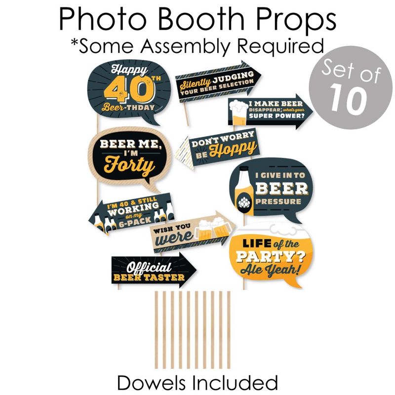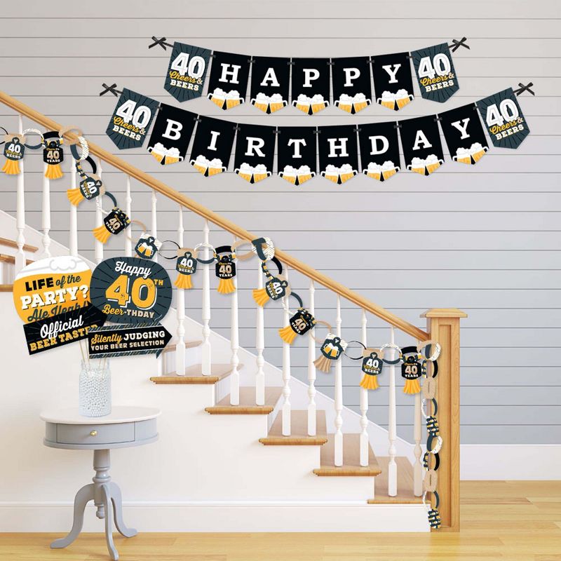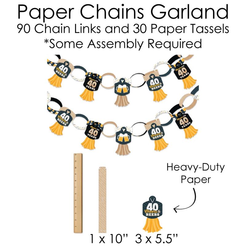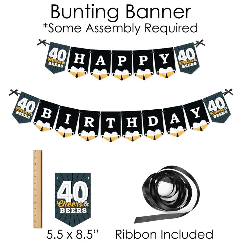 Doterrific Bundle INCLUDES: Bunting Banner "Happy Birthday", Paper Chains Garland 21 Feet, and Funny Photo Booth Props Kit 10-Piece. Style any birthday party with coordinating Cheers and Beers to 40 Years-themed party supplies. Use Cheers and Beers to 40 Years Doterrific Bundle to create an impressive photo booth backdrop. Please Note: Assembly Required. BUNTING BANNER: Greet your party guests with a Cheers and Beers to 40 Years bunting banner. Assemble the themed pennant flags with included ribbon and hang with the included wall mount adhesives. Each pennant measures 5.5 inches wide x 8.5 inches high. Satin ribbon measures 24 feet long and 3/8th of an inch wide. Hang at the entrance of your event, over the food table or candy buffet, at the gift table, or display in doorways or windows as a background for photo ops. PAPER CHAINS: Cheers and Beers to 40 Years paper chains decoration kit will arrive flat and is easy enough for the whole family to assemble. The heavy-duty paper tassels give our paper chains a unique flair. Dress up all areas of your birthday party with paper chains. For decorating fun, wrap paper chains down a staircase railing, hang above doorways, or use as a photo booth backdrop. For an effortless look, stretch paper chains garland down the center of your dining room table. PHOTO PROPS: 10-Piece Funny Cheers and Beers to 40 Years photo booth props include 4 speech bubble shapes (10.25 inches wide x 8.25 inches tall), 6 arrow shapes (10.5 inches wide x 4.5 inches tall, 10 wooden dowel sticks (12 inches tall). For easy assembly, adhesive dots and stickers are included. Capture memorable photos of friends and family as they laugh at the funny-themed sayings. Use photo props and dowels as centerpieces or scatter props throughout your event. MADE IN THE USA: Cheers and Beers to 40 Years Doterrific Bundle is designed and manufactured at our Wisconsin facility using materials that are Made in the USA. Professionally printed on sturdy cardstock paper with a photo-like shine, our kit parts are individually cut, inspected, and carefully packaged.