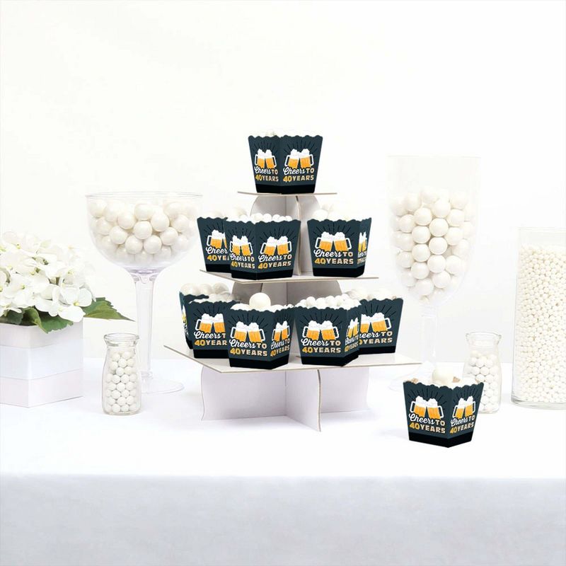 Cheers and Beers to 40 Years Mini Candy Boxes INCLUDES 12 fortieth party birthday party favor boxes. Cheers and Beers to 40 Years mini candy treat boxes are perfect for any event. The 40 theme is great for a birthday party. Cheers and Beers to 40 Years party favor mini candy boxes SIZE 2.75 inches tall x 3 inches square at the top. The unique design makes these 12 fortieth favor boxes a must-have for any birthday party. CANDY BOX PARTY SUPPLIES: Cheers and Beers to 40 Years candy boxes will hold a variety of party food. Fill them with sweet treats or salty snacks. Candies and other goodies will look amazing on your candy buffet with these 40th party favor boxes. PREMIUM PARTY FAVOR BOXES: Cheers and Beers to 40 Years party candy boxes are professionally printed on heavy-duty card stock paper with a photo-like shine. They are hand-folded and individually inspected, then carefully packaged. Candy boxes will arrive flat, partially assembled. Finishing assembly is required but it is easy. MADE IN AMERICA: Cheers and Beers to 40 Years - Mini Candy Boxes Birthday Party Favors are designed and manufactured at our Wisconsin facility using materials that are Made in America.