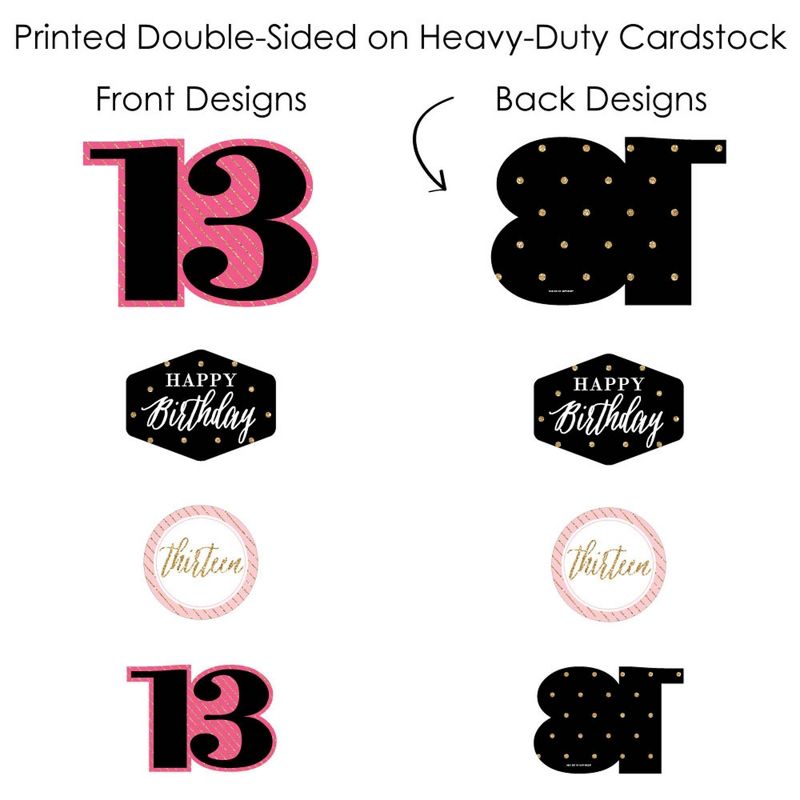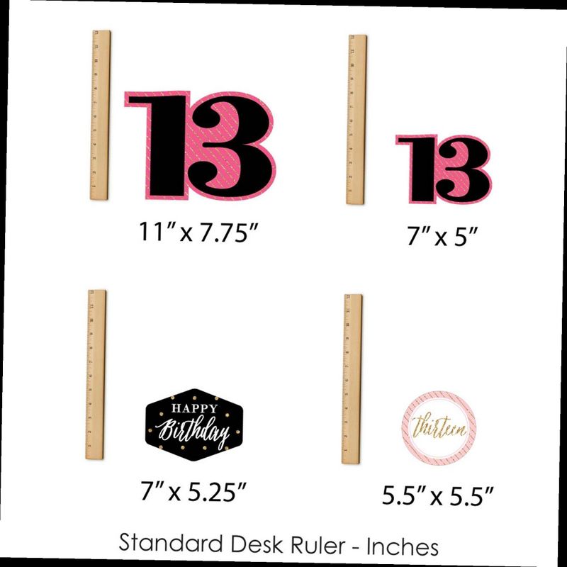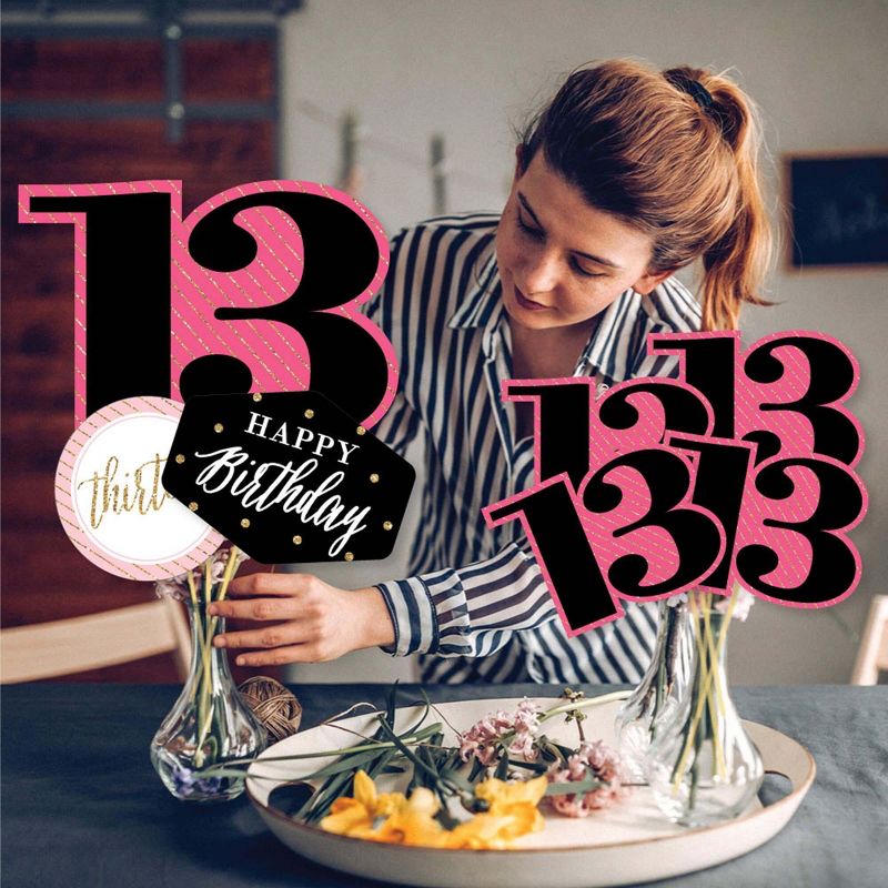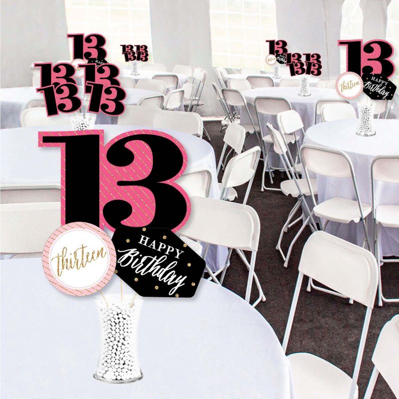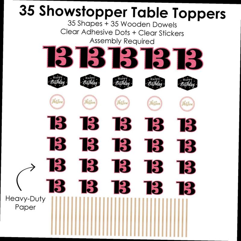 Chic 13th Birthday - Pink, Black and Gold Showstopper Table Toppers INCLUDE: 35 heavy-duty paper centerpiece cut-outs in our Chic 13th Birthday - Pink, Black and Gold theme. Each cut-out shape is printed double-sided and includes 35 wooden dowel sticks. DIY assembly is required. EASY TABLE DECORATIONS: Chic 13th Birthday - Pink, Black and Gold showstopper party centerpieces come with a variety of fun shapes and in the perfect sizes to create impressive tabletop decorations. Place assembled centerpiece sticks into jars or floral arrangements for that showstopper wow-factor. DIY PARTY CENTERPIECES: Chic 13th Birthday - Pink, Black and Gold party centerpiece kit arrives with wooden dowels and reinforcing stickers for easy DIY assembly. Simply press the included reinforcing sticker onto one dowel stick, near the end of dowel. Then, firmly press dowel to the back of a table topper shape. HIGH-QUALITY PARTY SUPPLIES: Chic 13th Birthday - Pink, Black and Gold showstopper table toppers are professionally printed double-sided on sturdy cardstock paper with a photo-like shine. They are individually inspected and carefully packaged by hand. Showstopper table toppers will arrive unassembled, leaving your DIY birthday party idea options endless. MADE IN THE USA: Chic 13th Birthday - Pink, Black and Gold showstopper table toppers are designed and manufactured at our Wisconsin facility using materials that are Made in the USA. Chic 13th Birthday - Pink, Black and Gold centerpieces decorations use a No-Mess Glitter Print: Our table topper decorations are designed with a printed image of glitter, eliminating glitter flake while maximizing bling effect!