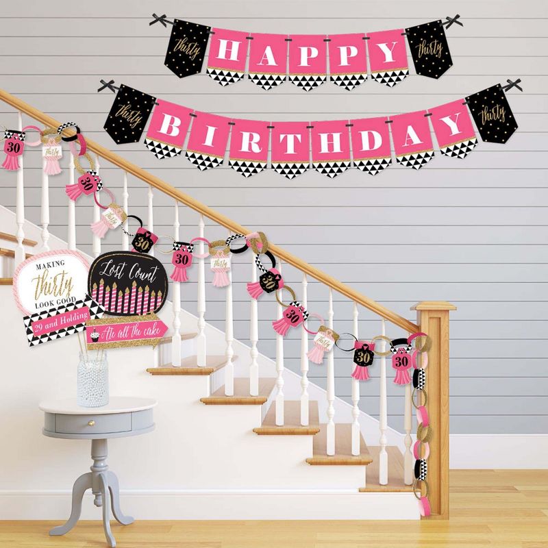 Doterrific Bundle INCLUDES: Bunting Banner "Happy Birthday", Paper Chains Garland 21 Feet, and Funny Photo Booth Props Kit 10-Piece. Style any birthday party with coordinating Chic 30th Birthday - Pink, Black and Gold-themed party supplies. Use Chic 30th Birthday - Pink, Black and Gold Doterrific Bundle to create an impressive photo booth backdrop. Please Note: Assembly Required. BUNTING BANNER: Greet your party guests with a Chic 30th Birthday - Pink, Black and Gold bunting banner. Assemble the themed pennant flags with included ribbon and hang with the included wall mount adhesives. Each pennant measures 5.5 inches wide x 8.5 inches high. Satin ribbon measures 24 feet long and 3/8th of an inch wide. Hang at the entrance of your event, over the food table or candy buffet, at the gift table, or display in doorways or windows as a background for photo ops. PAPER CHAINS: Chic 30th Birthday - Pink, Black and Gold paper chains decoration kit will arrive flat and is easy enough for the whole family to assemble. The heavy-duty paper tassels give our paper chains a unique flair. Dress up all areas of your thirtieth birthday party with paper chains. For decorating fun, wrap paper chains down a staircase railing, hang above doorways, or use as a photo booth backdrop. For an effortless look, stretch paper chain garland down the center of your table. PHOTO PROPS: 10-Piece Funny Chic 30th Birthday - Pink, Black and Gold photo booth props include 4 speech bubble shapes (10.25 inches wide x 8.25 inches tall), 6 arrow shapes (10.5 inches wide x 4.5 inches tall, 10 wooden dowel sticks (12 inches tall). For easy assembly, adhesive dots and stickers are included. Capture memorable photos of friends and family as they laugh at the funny-themed sayings. Use photo props and dowels as centerpieces or scatter props throughout your event. MADE IN THE USA: Chic 30th Birthday - Pink, Black and Gold Doterrific Bundle is designed and manufactured at our Wisconsin facility using materials that are Made in the USA. Professionally printed on sturdy cardstock paper with a photo-like shine, our kit parts are individually cut, inspected, and carefully packaged. Our Doterrific Bundle Kit use a No-Mess Glitter Print: Our DIY party decorations are designed with a printed image of glitter, eliminating glitter flake while maximizing bling!
