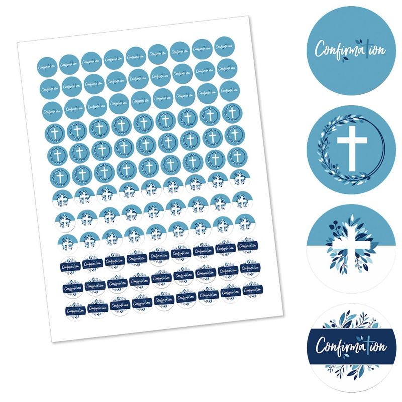 Confirmation Blue Elegant Cross Round Candy Favor Labels INCLUDES 108 round candy stickers - perfect for styling adorable boy religious party candy favors. Round candy labels will fit a variety of small candies with a flat, round bottom, such as chocolate Hershey's® Kisses®, wrapped peppermints or gold-wrapped caramel candies. Confirmation Blue Elegant Cross small, round candy stickers MEASURE .75 inches diameter and will quickly add a personal touch to all your sweet treats at the party. EASY PARTY DECORATIONS: Confirmation Blue Elegant Cross round candy sticker labels are an easy party decoration to add to your list of party supplies. Scatter decorated candies down your dining tables, package in small gift bags as a party favor or display in a pretty bowl at your candy buffet. Get creative with your Cross DIY boy religious party decoration ideas! PREMIUM PARTY SUPPLIES: Confirmation Blue Elegant Cross round candy labels are professionally printed on sticker paper with a photo-like shine. They are individually inspected and carefully packaged by hand. Simply attach each round candy sticker to your chosen candies. MADE IN THE USA: Confirmation Blue Elegant Cross - Religious Party Round Candy Sticker Favors are designed and manufactured at our Wisconsin facility using materials that are Made in the USA. Please Note: Candies are not included but are available at your local grocery store.