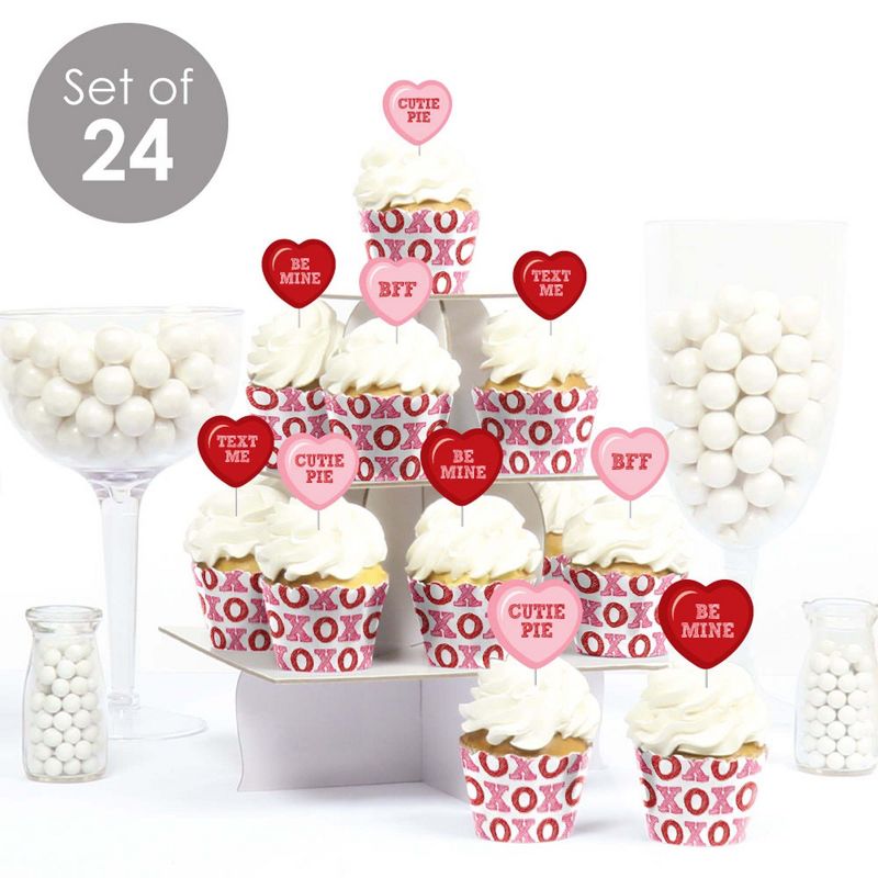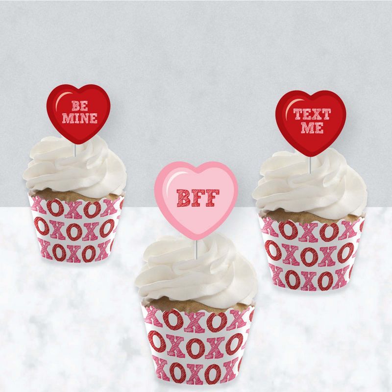 Conversation Hearts Cupcake Wrappers and Treat Picks Kit INCLUDES: 24 assorted shaped paper cut-outs, 24 clear treat picks, 24 cupcake wrappers, and adhesive dots for easy assembly. DIY Conversation Hearts cupcake decoration kit is perfect for any Valentine's Day party. Plastic clear treat picks SIZE measure 4" tall and are packaged in a food-safe environment. Conversation Hearts shaped paper cut-outs vary in size and coordinate well with pick size. Cupcake wrappers are cut with a decorative edge and adjust to fit cupcakes 1.75" - 2.5" Wide. Wrappers measure 1.75" Tall. Wrappers are meant for one-time-use only and should not be baked. EASY PARTY DECORATIONS: Conversation Hearts Valentine's Day Party Cupcake Decoration Kit makes it easy to style a red and pink theme party. Use the set of 24 to style the perfect dessert buffet or create impressive cupcake tower centerpieces. PREMIUM PARTY SUPPLIES: Clear treat picks are made of food-grade plastic and are packaged in a food-safe environment. The Conversation Hearts paper cut-out toppers are professionally printed, double-sided on sturdy cardstock paper with themed art on one side and a coordinating pattern on the back. Cut-outs will quickly attach to the clear picks with included adhesive dots and then easily insert into your party appetizers or desserts. EASY ASSEMBLY INSTRUCTIONS INCLUDED: Clear treat picks and Conversation Hearts shaped cut-outs and cupcake wrappers are packaged with easy assembly instructions.