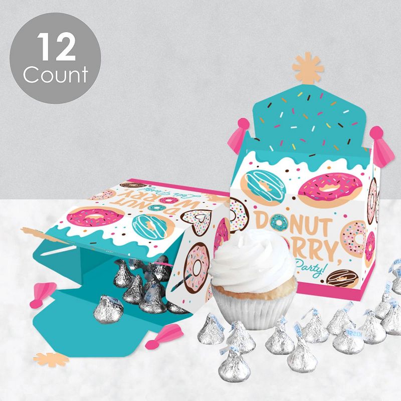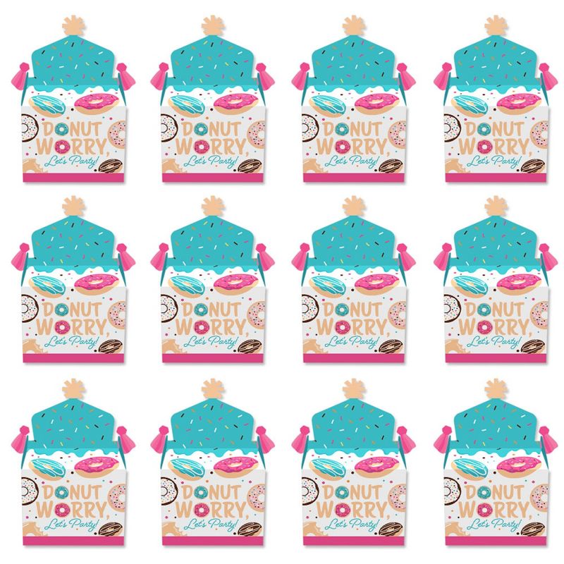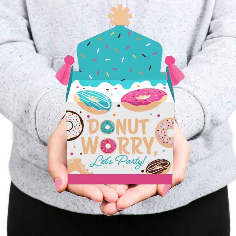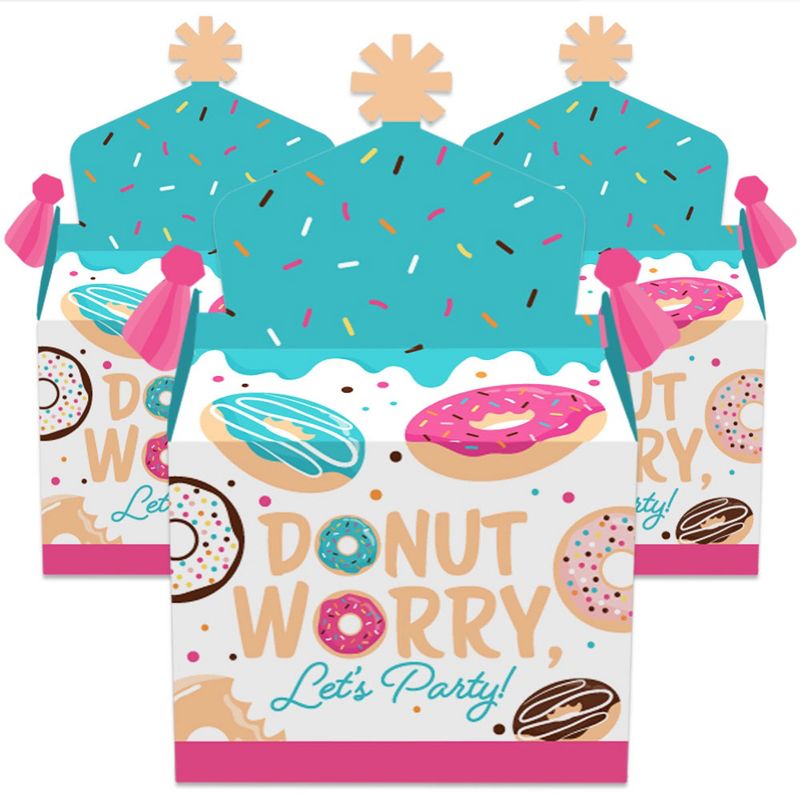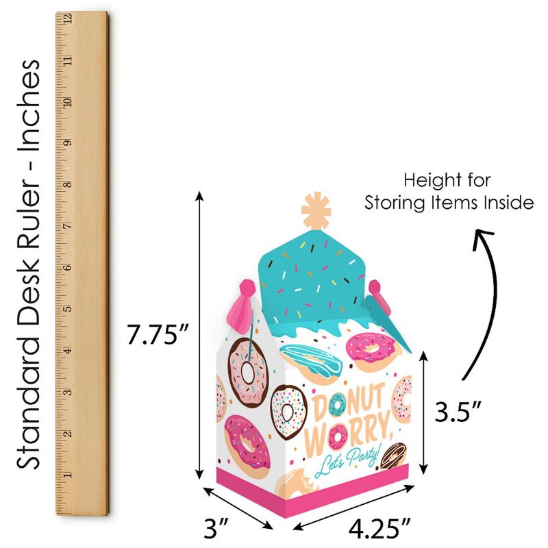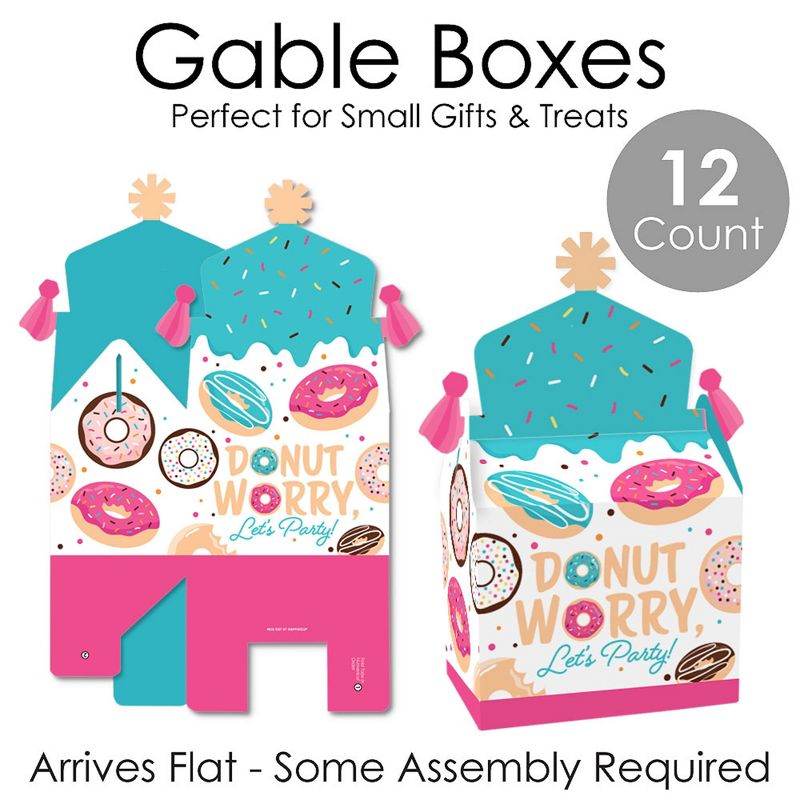 Gable Boxes INCLUDE: 12 Donut Worry, Let's Party-themed goodie party favor boxes. Each box SIZE measures 4.25 inches length x 3 inches width x 7.75 inches height. Gable favor boxes are ideal for small gifts and treats that are under 3.5 inches tall (height for storing items in closed box). FUN PARTY FAVORS: Use gable boxes for a unique party gift at any celebration party. This small, closed favor box can be filled with baked goodies, party trinkets, or thank you gifts. Party guests will have fun with the mystery of what each party loot box will contain. PREMIUM PARTY SUPPLY: Gable treat boxes are professionally printed and double-sided on heavy-duty cardstock paper, with a photo-like shine. They are hand-folded, individually inspected, and then carefully packaged. SIMPLE ASSEMBLY: Donut Worry, Let's Party gable boxes will arrive flat. Allow time for the required assembly of each box. Gable boxes have crease lines and numbered tabs for easy folding. Packaging will include assembly instructions. MADE IN THE USA: Donut Worry, Let's Party - Baby, Bridal Shower or Birthday Party goodie gable boxes are designed and manufactured at our Wisconsin facility using materials that are Made in the USA.