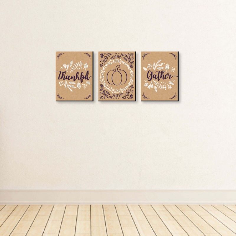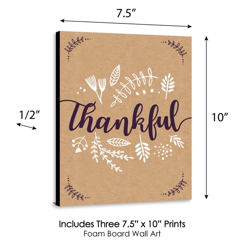 Elegant Thankful and Gather Wall Art Set INCLUDES 3 ready-to-hang fall themed panels and non-marking wall mounts for easy hanging. Thankful and Gather Thanksgiving artwork is perfect for home decor. Elegant Thankful and Gather Wall Art & Fall Decor SIZE each 10 inches high x 7.5 inches wide x .5 inches thick. Fall Thanksgiving lightweight art prints will arrive ready to use - no frame needed. The black edge gives each print a modern, finished look. EASY TO HANG: Simply attach a non-marking wall mount (included) to each corner of a Thankful and Gather art panel and press to hang in desired location. Wall mounts are repositionable, so you can redesign your artwork display at any time. PREMIUM HOME DECOR: 3-piece Thankful and Gather Wall Art Set is professionally printed on thick material with a black edge. You will not need to frame this set of Fall Thanksgiving room decor. Each standout print is ready to hang and will add a contemporary touch to any room. MADE IN THE USA: Elegant Thankful and Gather Fall Wall Art & Thanksgiving Room Decor is designed and manufactured at our Wisconsin facility using materials that are Made in the USA.