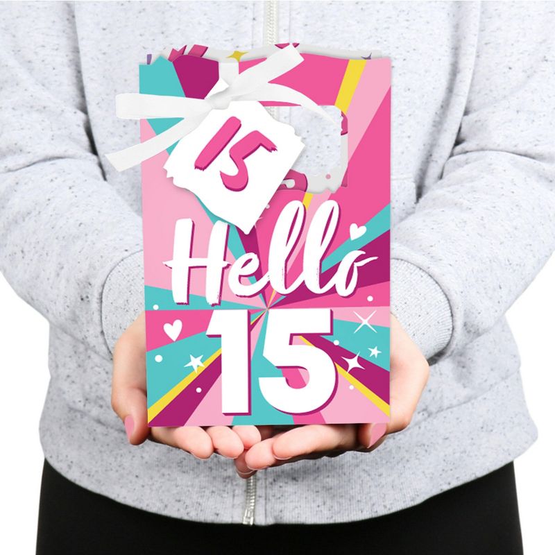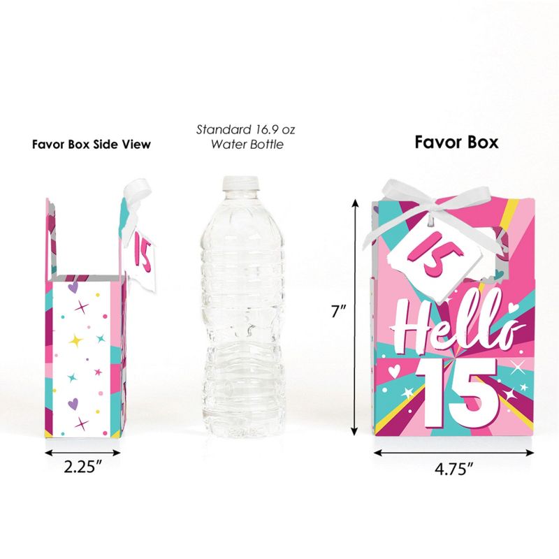 Girl 15th Birthday Favor Boxes INCLUDES 12 teen party favor bags, 12 gift tags and coordinating satin ribbon. Classic favor boxes are a party must-have. Teenager theme party supplies are great for a birthday party. Girl 15th Birthday Party Favor Boxes SIZE 4.75 inches wide x 4.75 inches high x 2.25 inches deep (fillable inside space) with a total height of 7 inches, including the handle. The coordinating gift tags and ribbon makes these 12 teen party favor boxes a complete treat bag party kit that everyone will love. FIFTEENTH BIRTHDAY PARTY SUPPLIES: Birthday party favor boxes will hold a variety of treats, prizes and party favors for your guests. Fill them with baked goodies, party trinkets or thank you gifts for adorable Girl 15th Birthday party favors! PREMIUM PARTY FAVOR BOXES: Girl 15th Birthday party favor boxes are professionally printed on heavy-duty cardstock paper with a photo-like shine. They are hand-folded and individually inspected, then carefully packaged. Favor boxes will arrive flat, partially assembled. Finishing assembly is required but it is easy. Once assembled, add the Girl 15th Birthday gift tag with the included ribbon for perfect party favors! MADE IN AMERICA: Girl 15th Birthday - Birthday Party Favor Boxes are designed and manufactured at our Wisconsin facility.