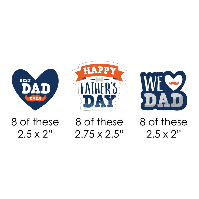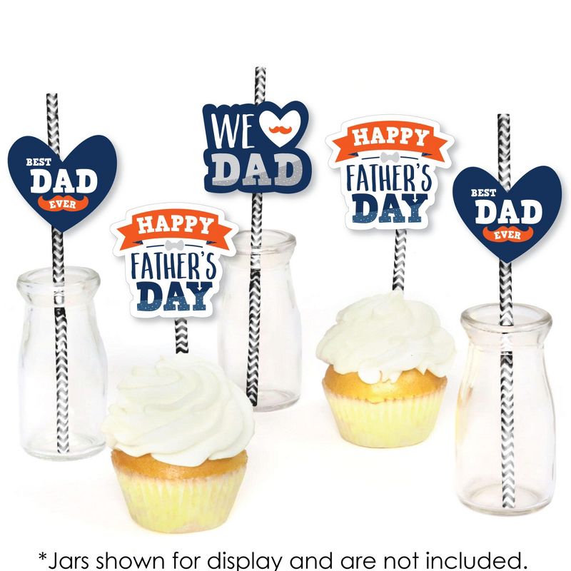 Happy Father's Day Straw Decor INCLUDES 24 dad paper cut outs, 24 coordinating paper straws & 40 clear stickers for easy assembly. Happy Father's Day DIY party supplies are perfect for a We Love Dad. Dad Straw Decor party kit SIZE 8 heart paper die cuts (2.5" X 2"); 8 Happy Father's Day (words) paper die cuts (2.75" x 2.5"); 8 We Heart Dad (words) paper die cuts (2.5" x 2") EASY PARTY DECORATIONS: Happy Father's Day straw decor will add a touch of style to your We Love Dad tables. Dad straw decor will also look great at your beverage bar. Use these adorable dad accessories as straws or swizzle sticks. The paper straws can also be cut in half and used as cupcake picks once the shaped cut out is attached. PREMIUM PARTY SUPPLIES: Happy Father's Day paper cut out straw decorations are professionally printed on heavy-duty card stock paper with a photo-like shine. They are individually inspected and carefully packaged by hand, along with coordinating paper straws. Happy Father's Day Straw Decor will require some easy assembly. Simply adhere the shaped cut outs to the straws using the included clear stickers. Get creative with your DIY We Love Dad decoration ideas! Please Note: Mason Jars shown for display purposes and are not included.