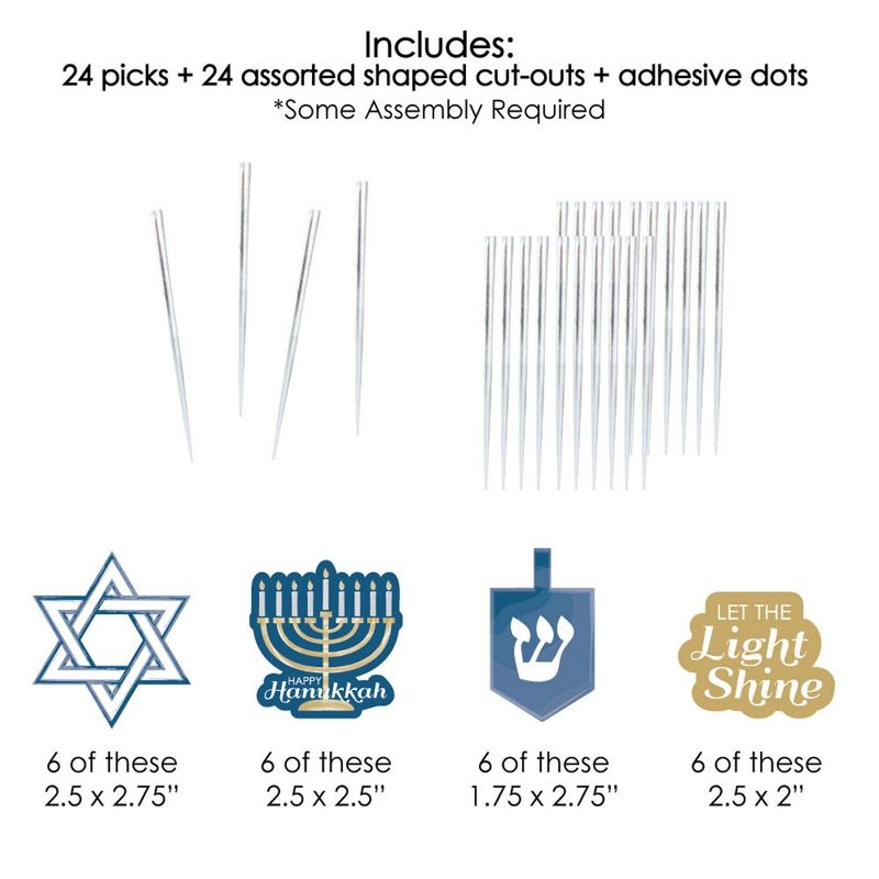 Happy Hanukkah Dessert Cupcake Toppers INCLUDES 24 clear treat picks, 24 shaped paper cut outs and stickers for easy assembly. DIY Happy Hanukkah cupcake supplies are perfect for a Chanukah. Plastic clear treat pick SIZE 4 inches tall with the completed height of the Happy Hanukkah Dessert Cupcake Topper depending on where the plastic pick is attached to the shaped paper cut out. Cupcake toppers are perfect for standard cupcakes and can also be added to appetizers and individual servings of other sweet treats such as brownies or donuts, and even used to create small fruit kabobs. EASY PARTY DECORATIONS: Happy Hanukkah Chanukah party picks make it easy to style a star of David theme party. Create impressive cupcake towers with decorated treats placed on a tiered stand at the candy buffet table, style adorable tables with individual cupcakes at each place setting, or make creative centerpieces using decorated treats and a coordinating treat stand. PREMIUM PARTY SUPPLIES: Clear treat picks are made of food-grade plastic and packaged in a food-safe environment. The Happy Hanukkah paper cut out toppers are professionally printed on heavy-duty cardstock paper with themed art on one side and a coordinating pattern on the back. Cut outs will quickly attach to the clear dessert pick and then easily insert into your party appetizers or desserts. EASY ASSEMBLY INSTRUCTIONS INCLUDED: Clear treat picks and Happy Hanukkah shaped cutouts will ship with easy assembly instructions to create unique dessert cupcake toppers.