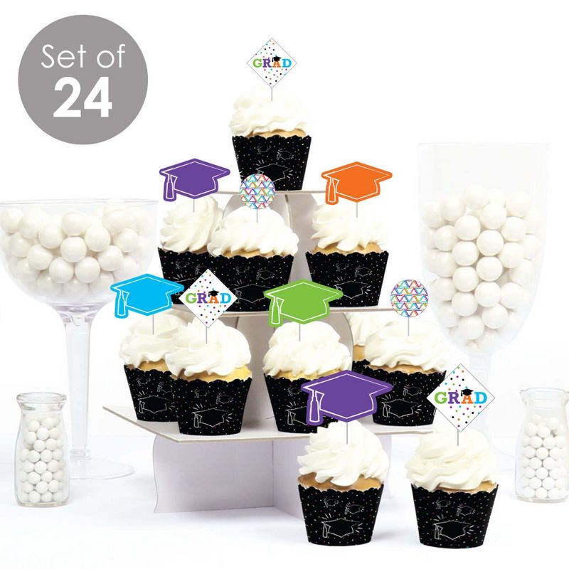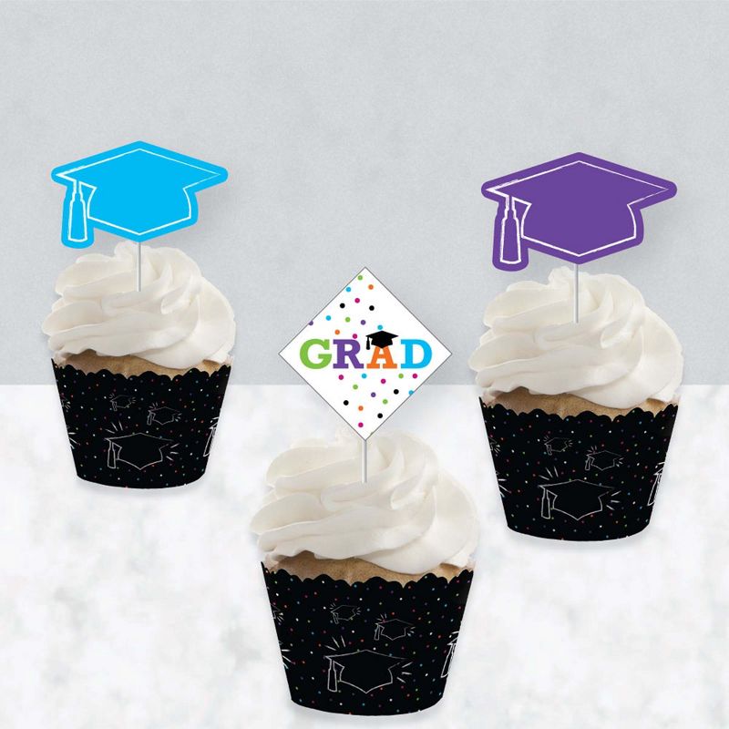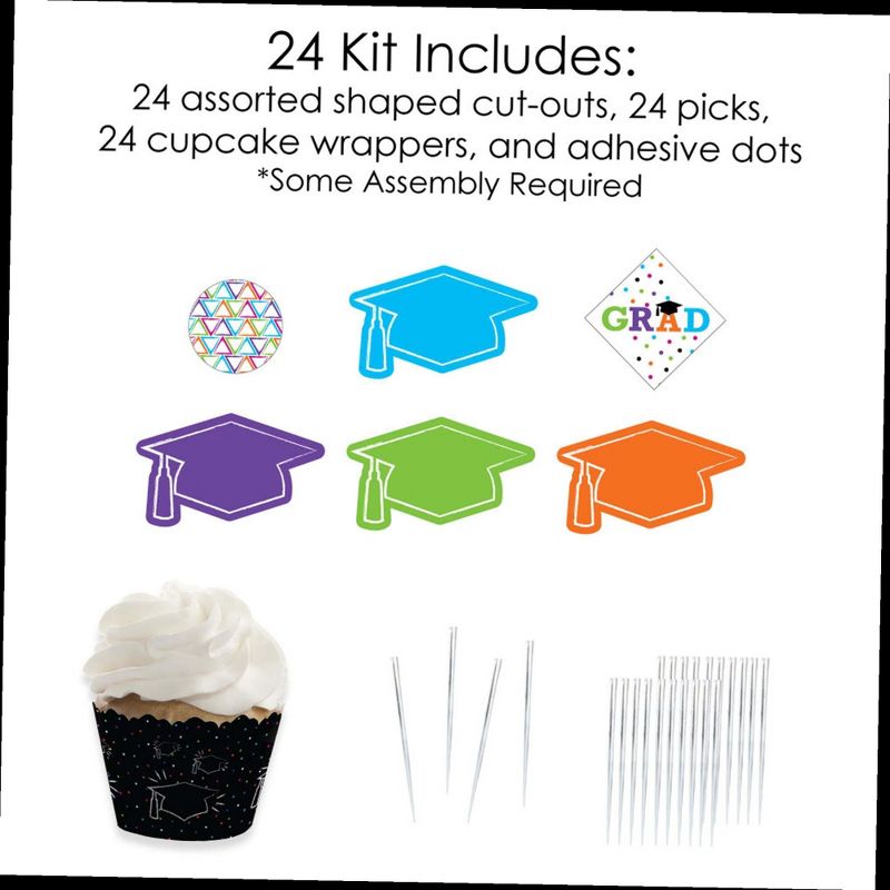 Hats Off Grad Cupcake Wrappers and Treat Picks Kit INCLUDES 24 assorted shaped paper cut-outs, 24 clear treat picks, 24 cupcake wrappers, and adhesive dots for easy assembly. DIY Hats Off Grad cupcake decoration kit is perfect for any graduation party. Plastic clear treat picks SIZE measure 4" tall and are packaged in a food-safe environment. Hats Off Grad shaped paper cut-outs vary in size and coordinate well with pick size. Cupcake wrappers are cut with a decorative edge and adjust to fit cupcakes 1.75" - 2.5" Wide. Wrappers measure 1.75" Tall. Wrappers are meant for one-time-use only and should not be baked. EASY PARTY DECORATIONS: Hats Off Grad Graduation Party Cupcake Decoration Kit makes it easy to style a grad theme party. Use the set of 24 to style the perfect dessert buffet or create impressive cupcake tower centerpieces. PREMIUM PARTY SUPPLIES: Clear treat picks are made of food-grade plastic and are packaged in a food-safe environment. The Hats Off Grad paper cut-out toppers are professionally printed, double-sided on sturdy cardstock paper with themed art on one side and a coordinating pattern on the back. Cut-outs will quickly attach to the clear picks with included adhesive dots and then easily insert into your party appetizers or desserts. EASY ASSEMBLY INSTRUCTIONS INCLUDED: Clear treat picks and Hats Off Grad shaped cut-outs and cupcake wrappers are packaged with easy assembly instructions.