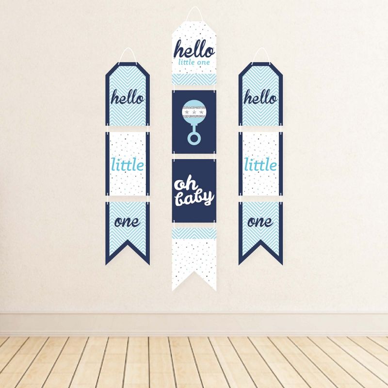 Hello Little One - Blue and Silver Indoor Door Decor INCLUDES: 10 heavy-duty paper pieces to create 3 vertical banners and 10 yards white 2mm satin cord. Easy assembly required. FUN PARTY BANNER: Vertical hanging door banners will create that wow-factor at your boy baby shower. Hang at the entrance of your event, over the food or gift table, or any open wall space to create a fun focal point. WALL DECORATION KIT: All banner sign pieces SIZE 7.5 inches wide x 10.75 inches. Each piece has pre-cut holes for easy DIY hanging with the included 10 yards of white 2mm satin cord. This DIY banner decor kit allows you to choose the spacing between each piece and string the cording through at your desired length. Clear adhesive stickers are also included to secure cording onto the back of each banner piece. PREMIUM PARTY SUPPLIES: Hello Little One - Blue and Silver hanging vertical door banner decoration pieces are professionally printed one-sided on heavy-duty cardstock paper. Each banner piece is individually inspected and carefully packaged by hand. Blue and silver wall decoration kit requires some easy assembly. Follow the number sequence on the back of each banner piece and simply string the included cording through the pre-cut holes. MADE IN THE USA: Hello Little One - Blue and Silver paper door banner decoration kit is designed and manufactured at our Wisconsin facility using materials that are Made in the USA. Hello Little One - Blue and Silver Indoor Door Decor use a No-Mess Glitter Print: Our DIY party banner decorations are designed with a printed image of glitter, eliminating glitter flake while maximizing bling effect!