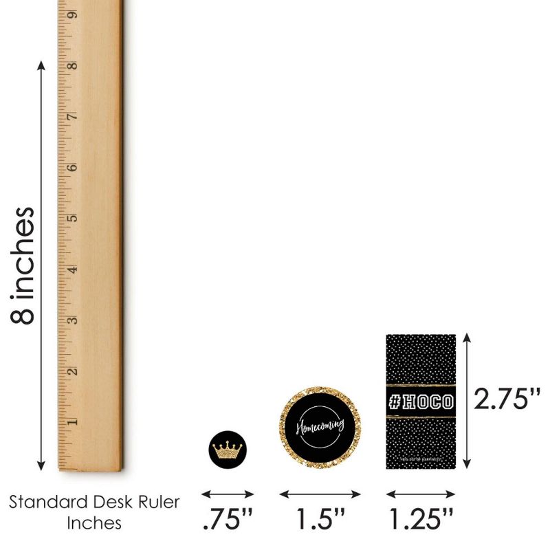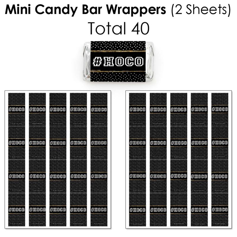 Hoco Dance Favor Kit: Candy Stickers INCLUDES: 2 sheets mini candy bar wrappers (total 40), 2 sheets round candy stickers (total 216), 2 sheets circle stickers (total 48). This 304-piece kit is perfect for styling a full candy buffet or use as unique party favors. Hoco Dance Favor Kit: Candy Stickers MEASURE: Mini Candy Bar Wrappers size 1.25 inches wide x 2.75 inches high and fit Hershey's® Miniatures® candy bars. Round Candy Stickers, size .75 inches diameter and fit on bottom of Hershey's® Kisses®. Circle Stickers, size 1.75 inches diameter. Note: Candy is not included. EASY ASSEMBLY: Easy assembly with this peel and stick favor kit. Simply center and press stickers onto your favorite candies to style dessert tables or decorate take-home favors for party guests. PREMIUM PARTY SUPPLIES: Homecoming Mini Candy Bar Wrappers, Round Candy Stickers, and Circle Stickers are professionally printed on sticker paper with a photo-like shine. They are individually inspected and carefully packaged by hand. Simply attached each sticker to your chosen candies. MADE IN THE USA: Candy Favor Sticker Kit is designed and manufactured at our Wisconsin facility using materials that are Made in the USA. Hoco Dance party decoration kit uses a No-Mess Glitter Print: Our party kits are designed with a printed image of glitter, eliminating glitter flake while maximizing bling effect! Note: Kisses® and Miniatures® are a trademark of the Hershey® Company. Big Dot of Happiness, LLC is not associated with any Hershey® candies mentioned.