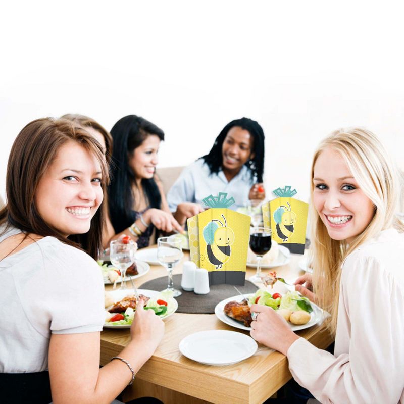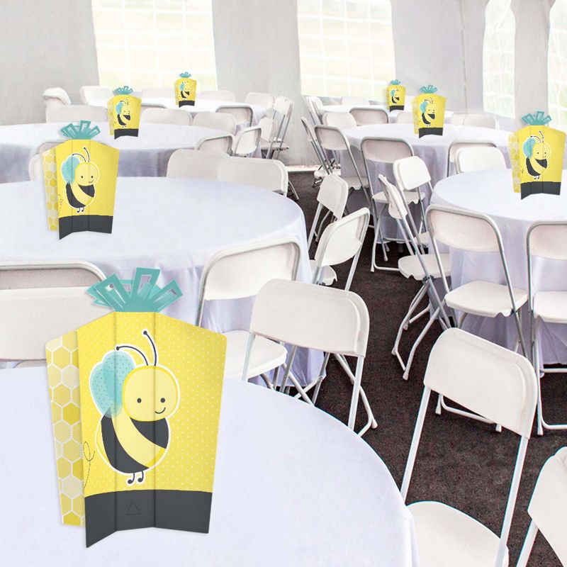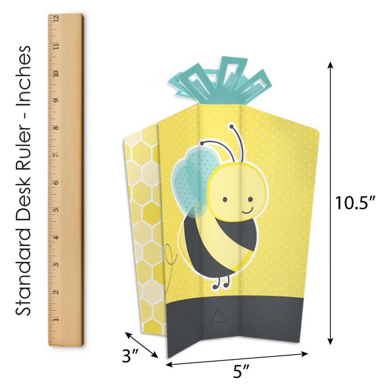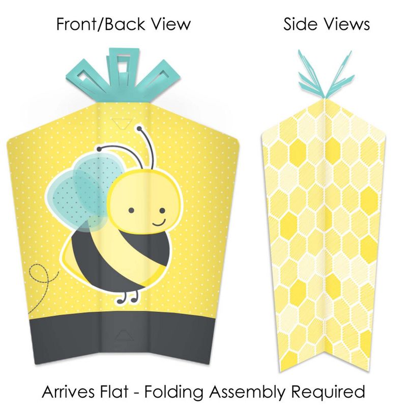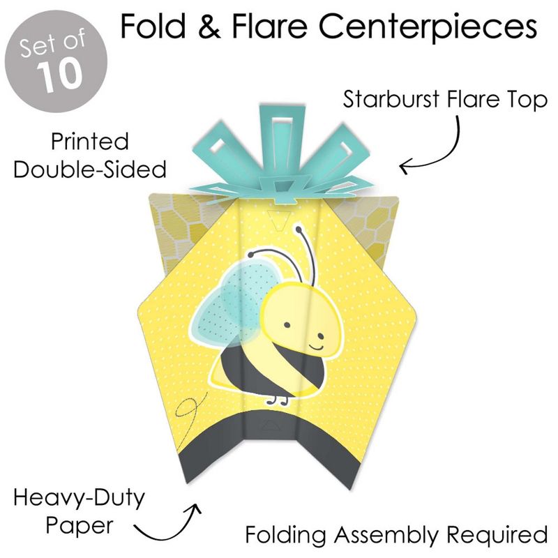 Honey Bee Fold and Flare Centerpieces INCLUDE: 10 heavy-duty paper centerpieces in our Honey Bee theme. Each centerpiece has art on all four sides and starburst top for an impressive display. Some simple folding assembly required. EASY TABLE DECOR: Each Honey Bee centerpiece SIZE 5 inches wide (front/back) x 3 inches wide (sides) x 10.5 inches tall. This 10 count table decorations set requires easy folding to flare out each centerpiece at your desired look. Easy DIY folding assembly: Use a flat surface to fold along the scored creases to stand the centerpiece upright and be able to balance on its own. PARTY CENTERPIECES: Style your baby shower or birthday party with Honey Bee table centerpiece decorations. Place in the center of multiple tables or add to all areas of the party such as welcome entrance, gift table, or dessert buffet for an extra flair. HIGH-QUALITY PARTY SUPPLIES: Honey Bee fold and flare centerpieces are professionally printed double-sided on sturdy cardstock paper with a photo-like shine. They are individually inspected and carefully packaged by hand. Fold and flare centerpieces will arrive flat, with easy folding required for quick assembly. MADE IN THE USA: Honey Bee fold and flare centerpieces are designed and manufactured at our Wisconsin facility using materials that are Made in the USA.