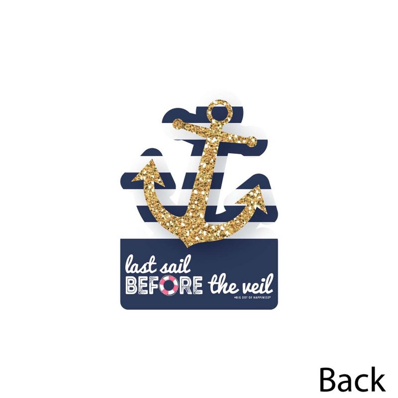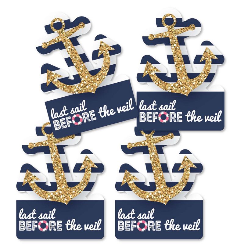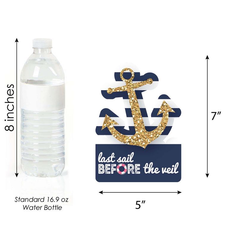 Last Sail Before The Veil DIY Party Essential Kit INCLUDES 20 extra-large anchor shaped cut outs - Great for bringing all your DIY bridal shower or bachelorette party ideas to life! DIY PARTY SUPPLIES: Last Sail Before The Veil party essentials include 20 large cut outs in anchor shapes that coordinate with the sailor party theme. Set of 20 nautical shapes SIZE 20 anchor shapes 5" x 7". The unique design and large size makes these gold and blue party decorations an impressive addition to any bridal shower or bachelorette party. BACHELORETTE PARTY DECORATIONS: Last Sail Before The Veil DIY party essentials are printed with characters on both sides, so they are perfect for centerpieces or hanging decorations. Hole-punch them and string together as a bridal shower or bachelorette party banner, or hang individually as ceiling decorations. Last Sail Before The Veil large shaped cut outs will make a statement however you choose to use them. HIGH-QUALITY PARTY SUPPLIES: Last Sail Before The Veil DIY Party essentials are professionally printed on heavy-duty cardstock paper with a photo-like shine. They are individually inspected and carefully packaged by hand. bridal shower or bachelorette party essentials will arrive ready to use in all of your creative DIY party ideas! MADE IN THE USA: Last Sail Before The Veil - Anchor Shaped Decorations DIY Nautical Bridal Shower & Bachelorette Party Essentials are designed and manufactured at our Wisconsin facility using materials that are Made in the USA. Last Sail Before The Veil party essentials use a No-Mess Glitter Print: Our DIY party supplies are designed with a printed image of glitter, eliminating glitter flake while maximizing bling effect!
