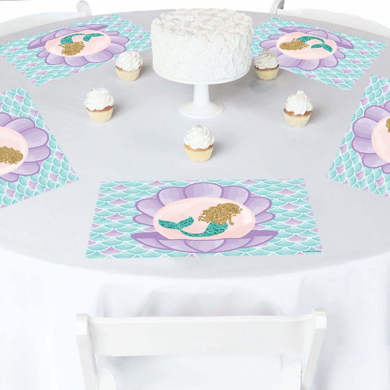 Let's Be Mermaids Placemats INCLUDE: 16 paper placemats. Placemats will arrive flat and party ready! EASY CLEAN UP: Let's Be Mermaids paper placemats SIZE 15.5 inches wide x 11.5 high. Made of sturdy cardstock paper, these disposable placemats will make it easy to clean up after the party is over. Party placemats are perfect for at-home dining tables or to bring to your favorite restaurant as an easy decoration. PARTY TABLE DECORATIONS: Placemats are a fun and easy party table decoration for a Let's Be Mermaids baby shower or birthday party. Use Let's Be Mermaids party placemats to style dining tables, buffet tables, banquet halls, and more! Let's Be Mermaids party table decoration placemats will make a statement however you choose to use them. PAPER PLACEMATS: Set of 16 Let's Be Mermaids placemats are professionally printed on sturdy cardstock paper. Each placemat is individually inspected and carefully packaged to arrive flat. MADE IN THE USA: Let's Be Mermaids paper party placemats are designed and manufactured at our Wisconsin facility using materials that are Made in the USA. Let's Be Mermaids paper placemats use a No-Mess Glitter Print: Our placemats are designed with a printed image of glitter, eliminating glitter flake while maximizing bling effect!