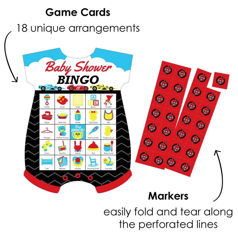 Let's Go Racing - Racecar - Shaped Picture Bingo Cards and Markers INCLUDES 18 game cards, 18 perforated marker sheets, 1 perforated call sheet, and game instructions. MUST-HAVE PARTY SUPPLY: Bingo is an easy and classic baby shower game that everyone will have fun playing. Let's Go Racing - Racecar - Shaped Picture Bingo Cards and Markers give this classic game a fresh look with baby bodysuit-shaped playing cards and baby related pictures instead of numbers. HOW TO PLAY: Begin play by the designated bingo leader pulling a caller chip from the bowl. Each guest covers the called picture on their card with square marker. Continue until a guest has covered a row of pictures in any direction - vertically, horizontally, or diagonally and calls out "BINGO!". HIGH-QUALITY: Let's Go Racing - Racecar Picture Shaped Bingo Cards and Markers are professionally printed and double-sided on sturdy cardstock paper. They are individually inspected and carefully packaged by hand. Each baby bodysuit-shaped card measures 5.25” Wide x 6.75” Tall, perforated marker sheets measure 2.75” Wide x 5” Tall and individual markers measure 0.75” Wide x 0.75” Tall. MADE IN THE USA: Let's Go Racing - Racecar - Shaped Bingo Cards and Markers are designed and manufactured at our Wisconsin facility using materials that are Made in the USA.